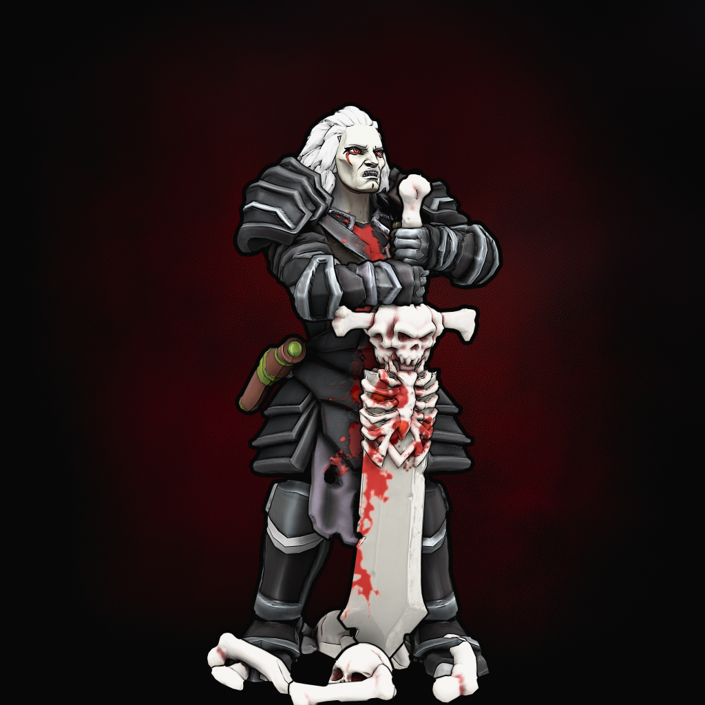 Tyrannus appears as a well-built, chiseled man adorned in black plate-mail armor and a giant half helm. The stony features of his face would be considered handsome by many, except his blood-red eyes and a mouth that features prominent fangs makes his appearance even more intimidating. He carries an ornate ebony bastard sword that often drips with blood. He is a rival of his half-brother, Tempus.