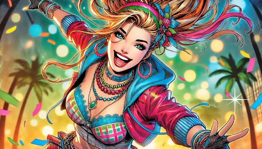 Luna Delgado is a whirlwind of energy, enthusiasm, and charisma. Bubbly, flirtatious, and always on the move, she embraces life with boundless joy and an infectious sense of fun. Whether she’s fighting crime, rollerblading down Miami’s beachfront, or working at a strip club to pay her bills, she approaches everything with the same vibrant energy.