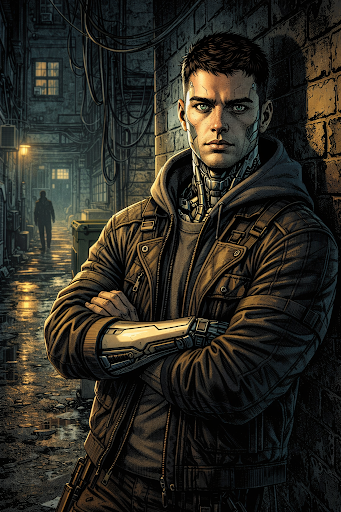 Shattered in body and spirit, Leo recovered only through the intervention of the Datajackers, who took him in. Not out of revenge, but out of a deep, paralyzing fear of the Ruso family, Leo joined the gang for protection. Blair Springhill helped him secure advanced bionic enhancements to restore his broken limbs and plastic surgery to reconstruct his shattered face. Now, augmented by technology and driven by fear, Leo has become one of Blair’s most trusted lieutenants, though the specter of Carmine Ruso still haunts him.