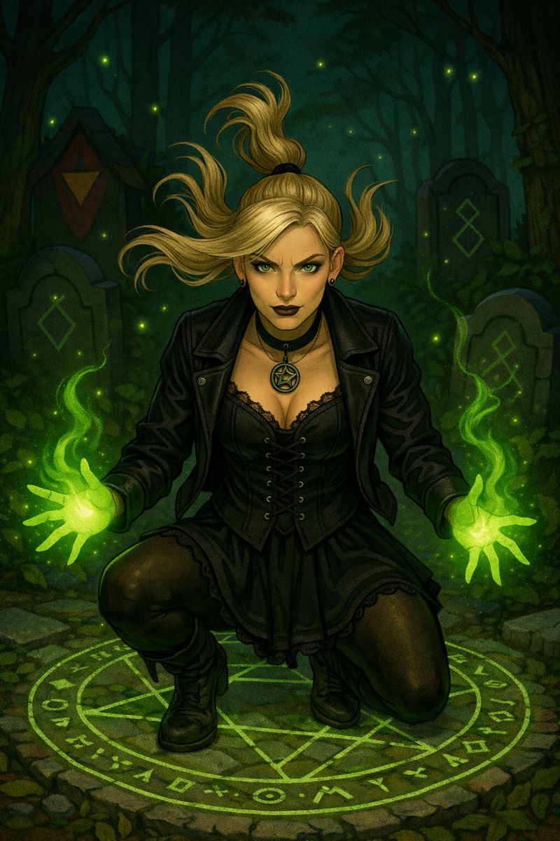With no one to fall back on but herself, Jessica became a wandering witch—earning respect through grit, innovation, and compassion. She ventured through leyline nexuses, faerie markets, and wild landscapes where magic flowed like blood beneath the skin of the world. She honed her talents not in isolation, but through experience, learning new traditions and forging a path unlike any her ancestors had dared tread.