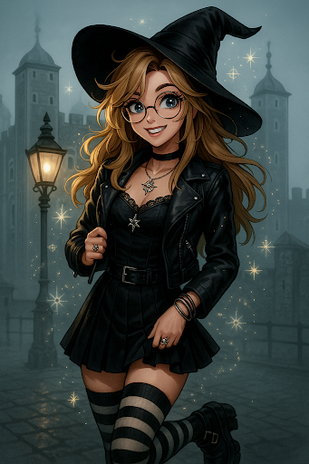 A faint aura of “reality wobble” clings to her, subtle enough that mundanes shrug it off, but witches feel it instantly. Candles flicker when she smiles. Dice roll too high when she laughs. Teapots warm in her presence. And of course, she has the signature Whitmore thigh-highs-and-platforms look — a fashion choice that has become so iconic people swear they can identify her by silhouette alone.