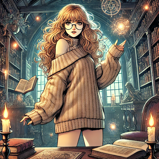 Her skin is fair and often smudged with ink, shimmer-dusted from spell residue, or marked with faint scorch lines from “technically correct magical experiments.” Her hair is an untamed waterfall of wavy dirty-blonde chaos, forever catching runes, feathers, TTRPG dice, or whatever magical nonsense decides to orbit her that day.