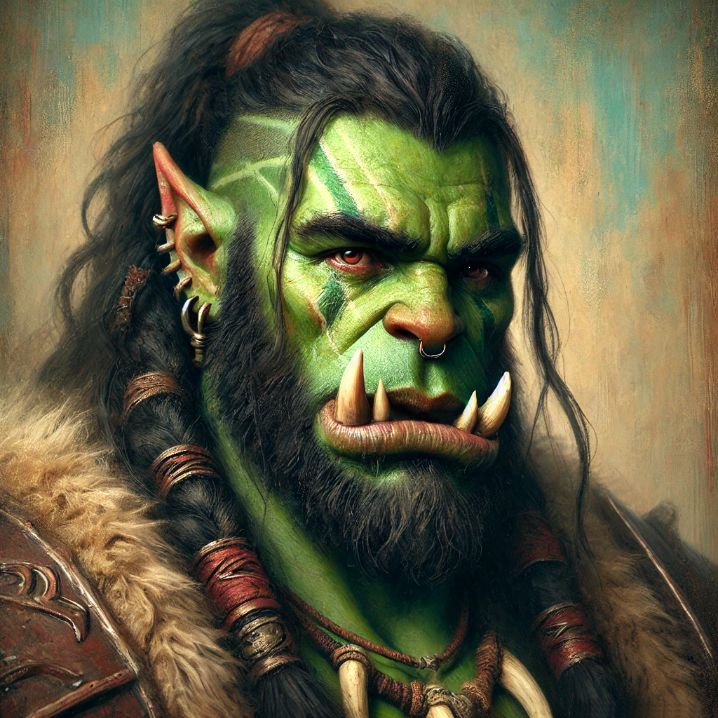 Halvor is in peak physical condition, his physique embodying the strength and resilience of a seasoned orc warrior. Standing at an imposing 7'4" (2.24 meters) and weighing a solid 300 lbs (136 kg), Halvor is a force to be reckoned with. His muscular frame is well-defined, a testament to years of battle and leadership, yet he moves with the agility of a much lighter fighter. Despite his size, Halvor maintains remarkable dexterity, often catching opponents off guard with his swiftness in combat. His strong presence and intense physicality make him an imposing leader among his people.
