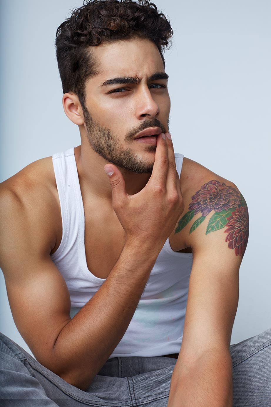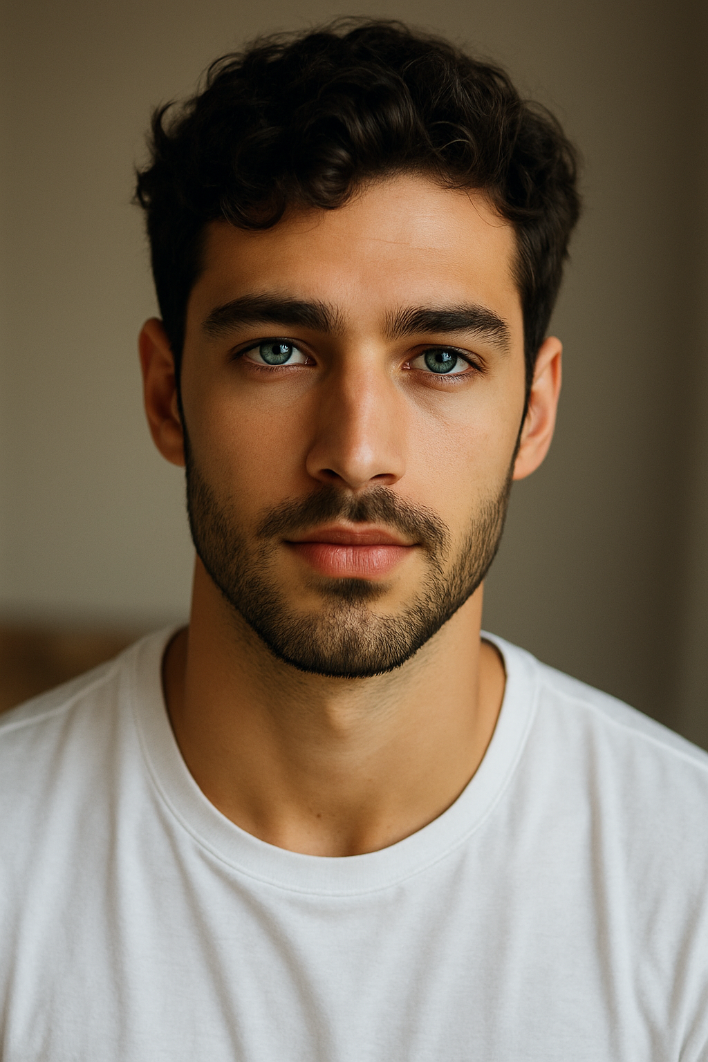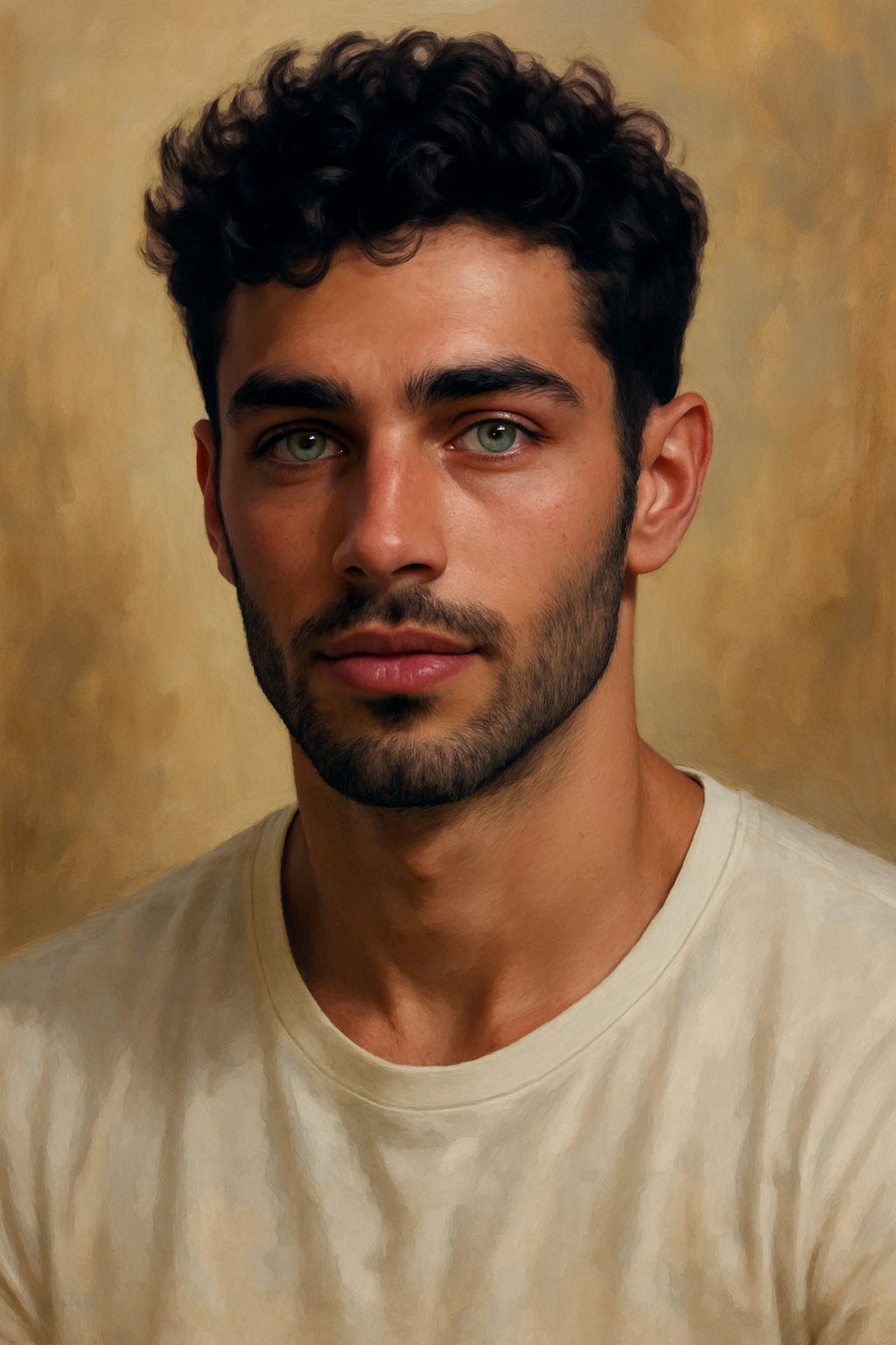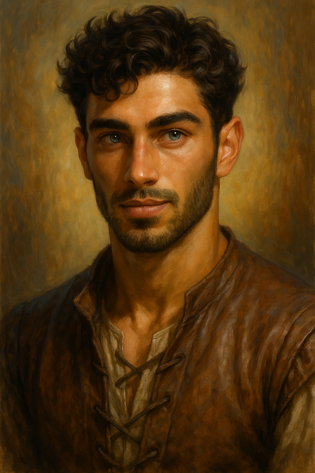Mateo is a man of lean, athletic build, standing at 5’11” with the natural grace of someone accustomed to movement and the outdoors. His warm olive skin carries the subtle kiss of the sun, complemented by a strong jawline and neatly kept facial hair. Dark, tightly curled hair frames a face defined by expressive brows and striking green eyes flecked with gold—eyes that seem to hold both warmth and a quiet, watchful intensity.