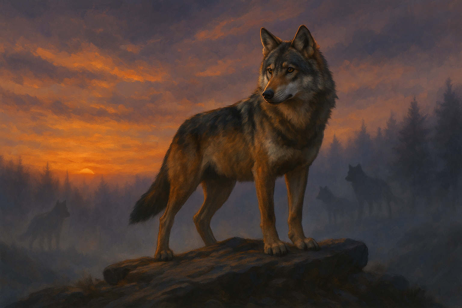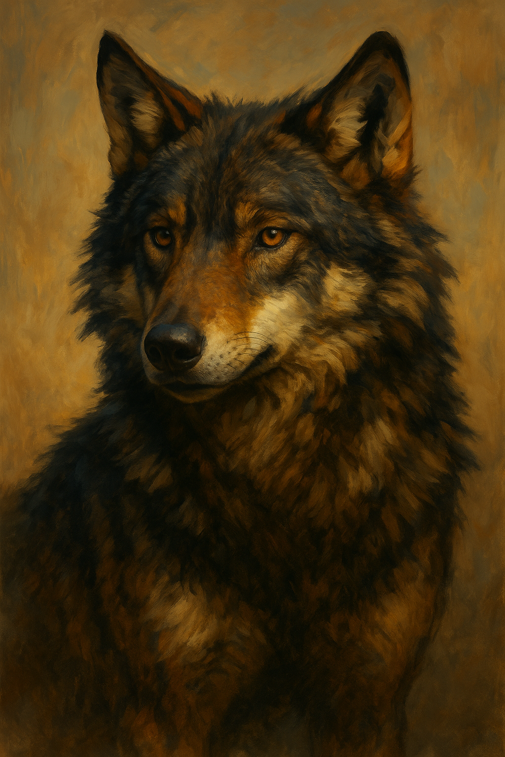 In his wolf form, Mateo takes on the lithe strength of the Iberian wolf, standing just over two and a half feet at the shoulder with a body built for speed and endurance. His coat blends tawny browns, grays, and black, with lighter fur tracing his underbelly and throat. The same green-gold eyes pierce through this form, an unchanging reflection of the man within, and a reminder that his wolf is not a separate beast, but a true extension of himself.