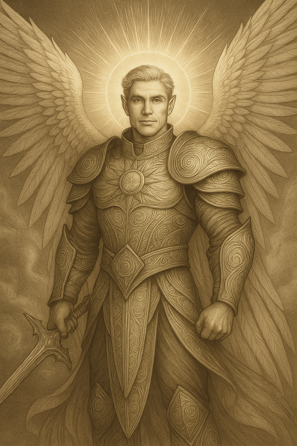 Han bär rustning av gudomligt guld med inristade mönster som skiftar beroende på vem som tittar, ibland ser man solsymboler, ibland texter från den Heliga Boken. En strålande halo svävar bakom honom. Han bär ett svärd som aldrig används men alltid hotar, för ibland räcker det att veta att han kan.