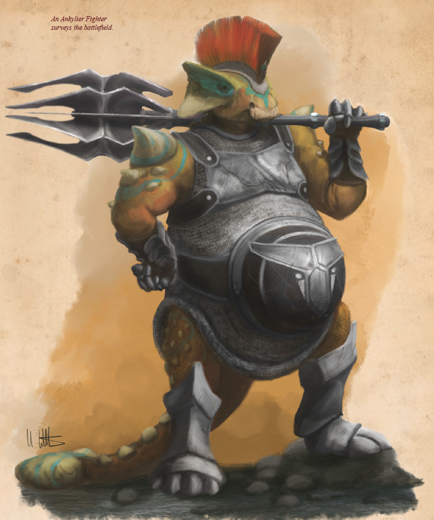 A medium humanoid Saurian race descended from Ankylosaurs (the family, not the singular species). They can live for 90-100 years, though an Ankylier who makes it to that age is somewhat unusual thanks to their tendency to take up positions in society that risk injury, such as guards, soldiers, laborers, or other physically intensive jobs. While they're not the only large Saurian species, Ceratians and Deinodons can also get quite bulky, few match the breadth and bulk of the average Ankylier. While seeing an Anklyier working in a city isn't odd, often the families will live in the more open spaces around the city, where they and their children aren't confined to cramped city housing.