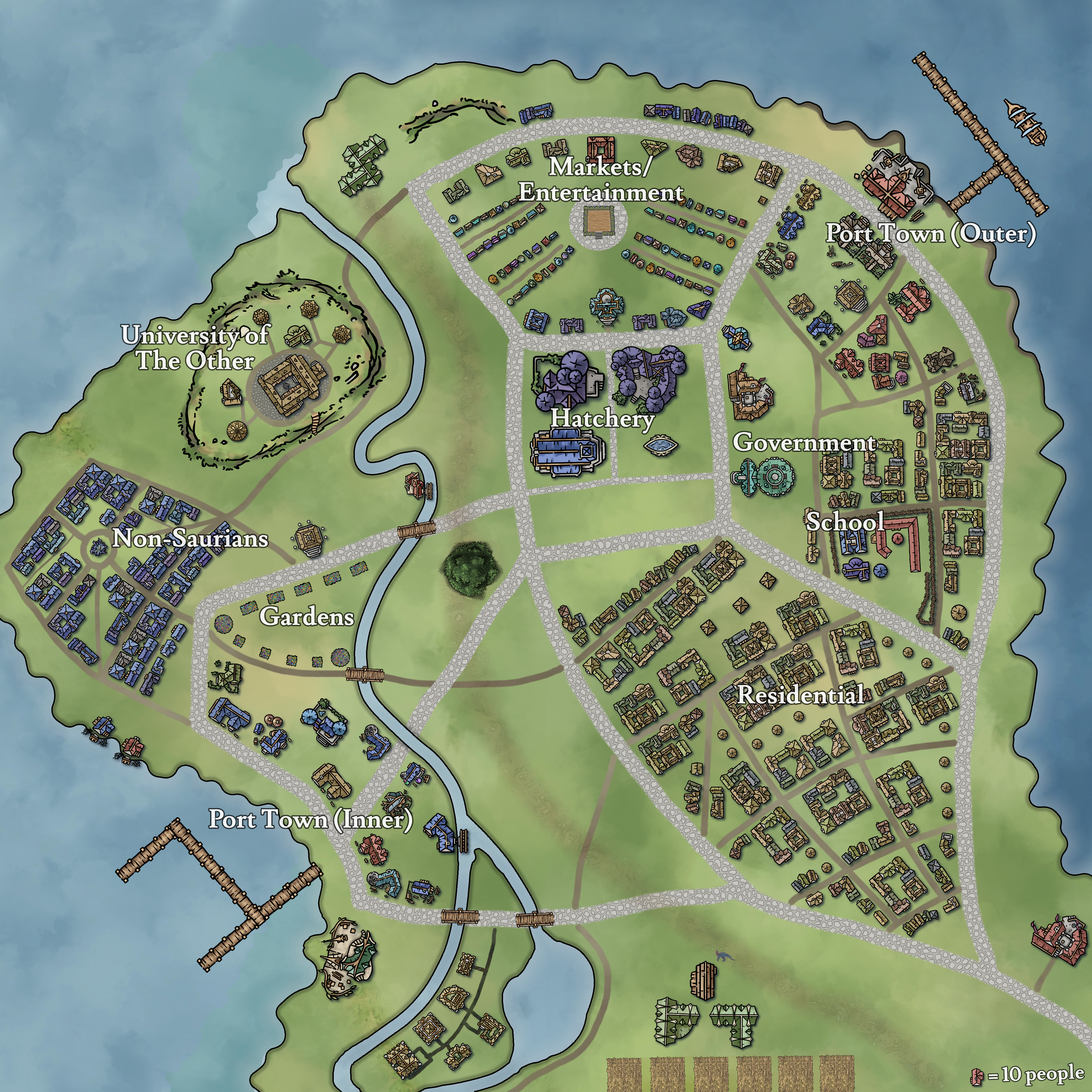The city has formed naturally into separate districts with fuzzy lines between them, with two port districts to match the two docks. While there are plenty who live in the city in multi-unit housing, the city also spreads in a manner that drifts from urban to suburban down the peninsula, though a large space is given to the Portal. Eventually it drops off into a more rural landscape, with fishing and farming being plentiful around the edge of The Shallow Sea and into the southern plains. Other districts include the commercial zone, the trade/shopping district, a more cultural area, and the non-Saurian neighborhood. While there's no official policies on where non-Saurians can live, they tend to find the accommodations in that neighborhood more friendly for mammals than the rest of Promenade's living areas.