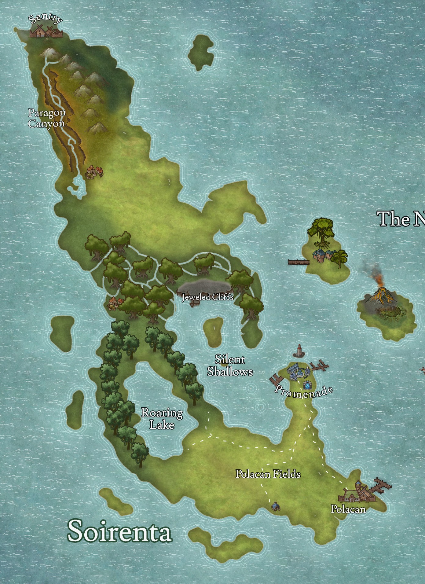 The western continent of The World Behind's two main continents, it consists of two large savanna separated by a hot, humid band of swamp and muggy forest, with one definitively inland sea called The Silent Shallows, and one large lake that some argue also is an inland sea called Roaring Lake/Sea (depending on which side of the argument you're on). On the northern tip of the continent is an old mountain range that has been eroded over time, with deep and ancient roots. Along the western side of the mountains runs the Paragon river, which has carved into the earth, creating the vast Paragon Canyon.