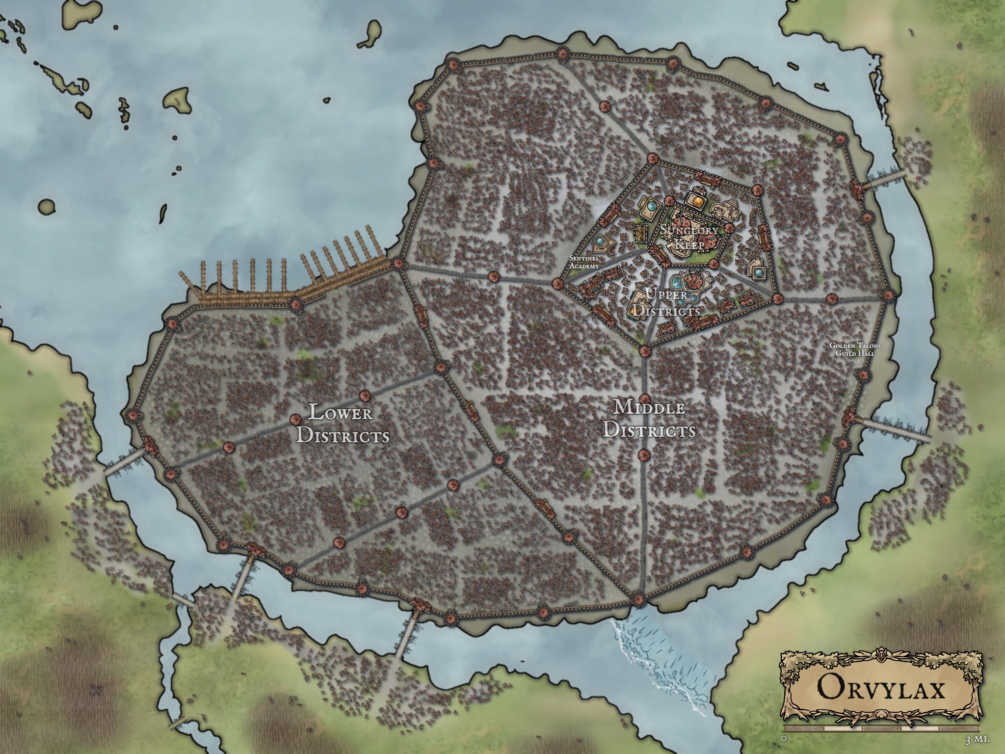 Ovyliax is a strategically and beautifully situated city, built where the fertile Ulgarthan heartlands meet the shimmering expanse of the Copper Bay. The city is renowned for its striking, white-stoned gothic architecture and its unique, three-tiered structure.