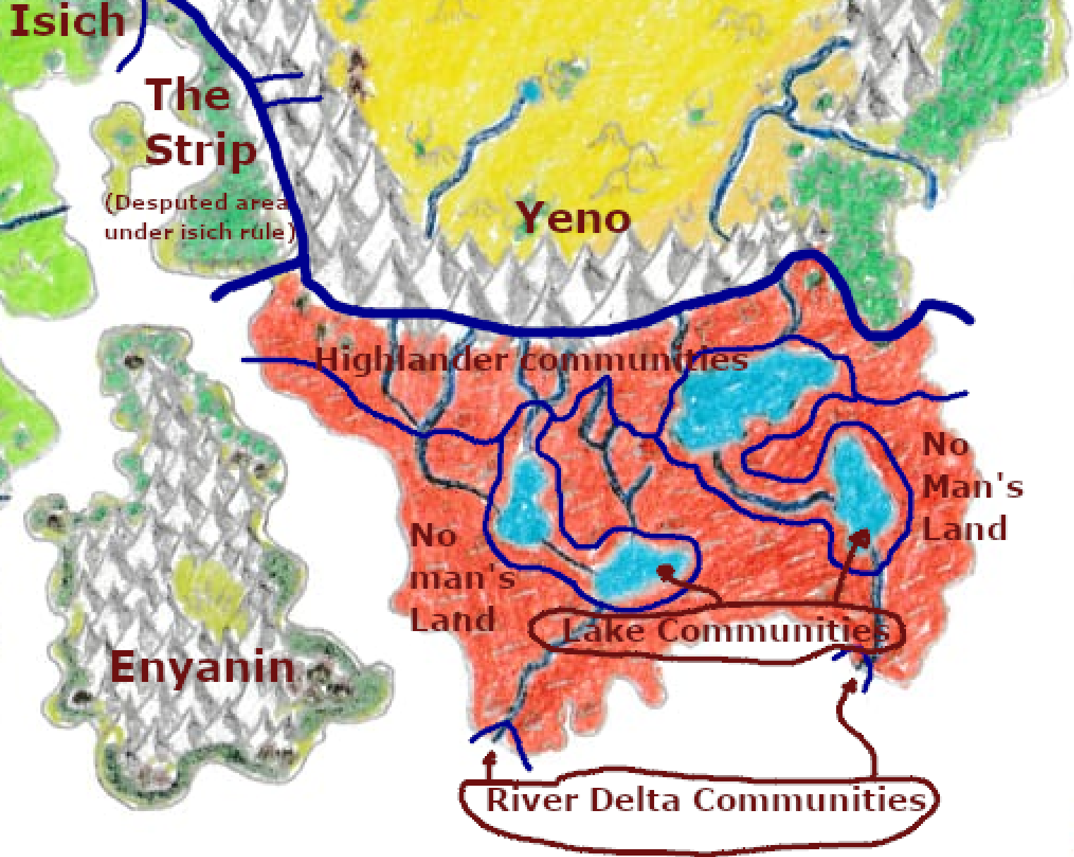 One part of the highlands, known as The Strip, was particularly prized for its fertility and strategic importance in continental trade. However, it was recently seized by the nation of Isich, displacing many Khellan families. Refugees have spread across the remaining highlands, though some chose to remain in The Strip, now under foreign rule.