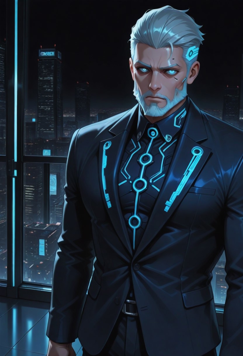 | Attire | Custom-tailored black and silver corporate suit woven with glowing cyan circuitry |