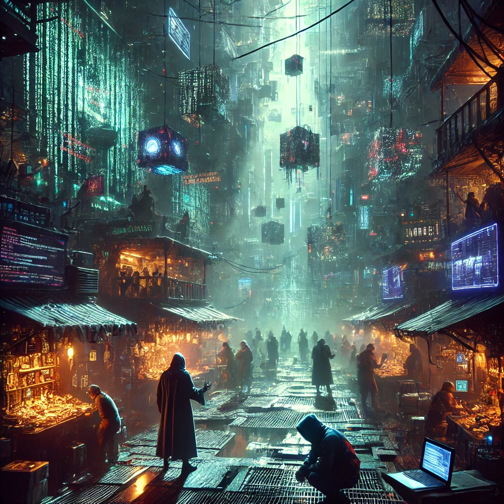 The Hollow Market is the largest underground marketplace in The Zone, a shifting, chaotic network of illicit trade where hackers, rogue AI, information brokers, and digital smugglers conduct their dealings away from the eyes of The Zone Authority. Located deep within The Underbelly, it is a haven for the desperate, the cunning, and the reckless—a place where corporate secrets, black-market AI modifications, and restricted software are just another commodity.