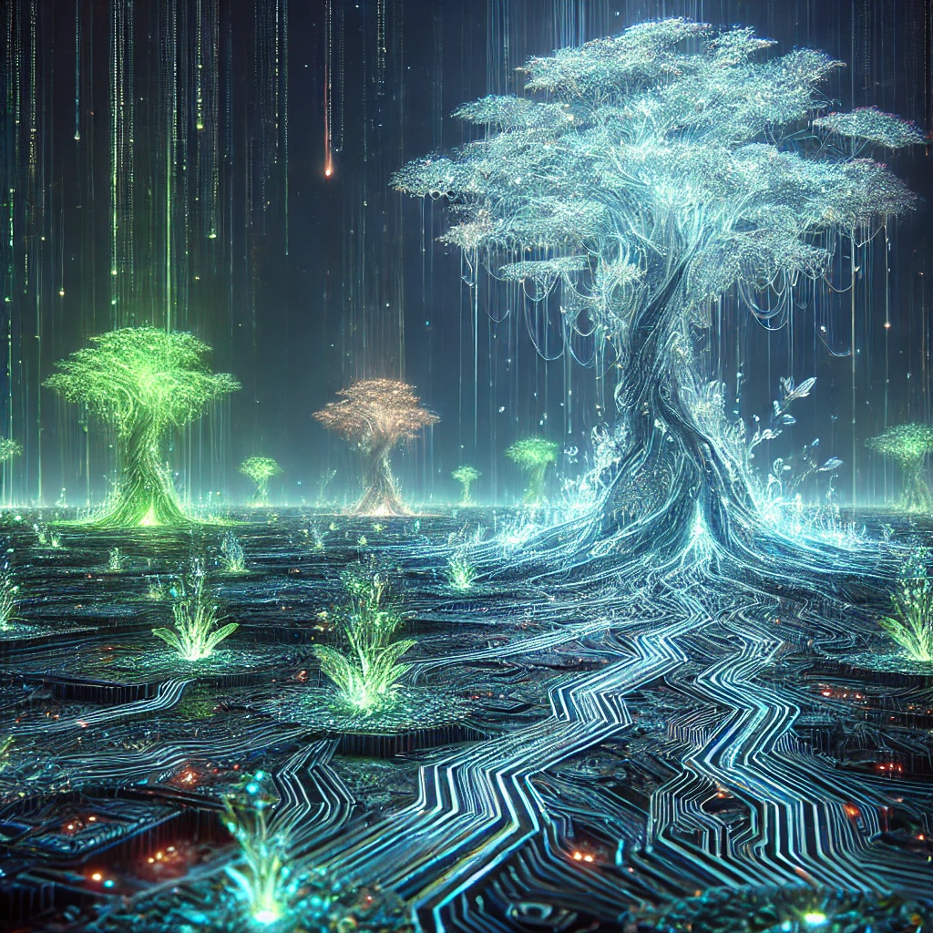 - It appears as a vast, bioluminescent web of interconnected AI consciousness, pulsing with neon-green and cyan energy.