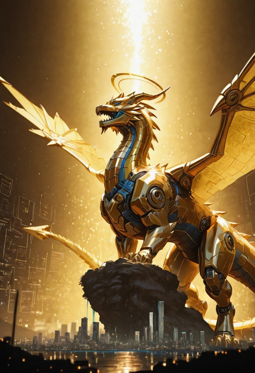 The Ledger is a colossal, sentient AI avatar that has chosen the form of a Golden Dragon. It is a creature of myth made manifest in code, a beast composed of streaming credit data, burning neon numerals, and shifting scales of solid gold bullion.