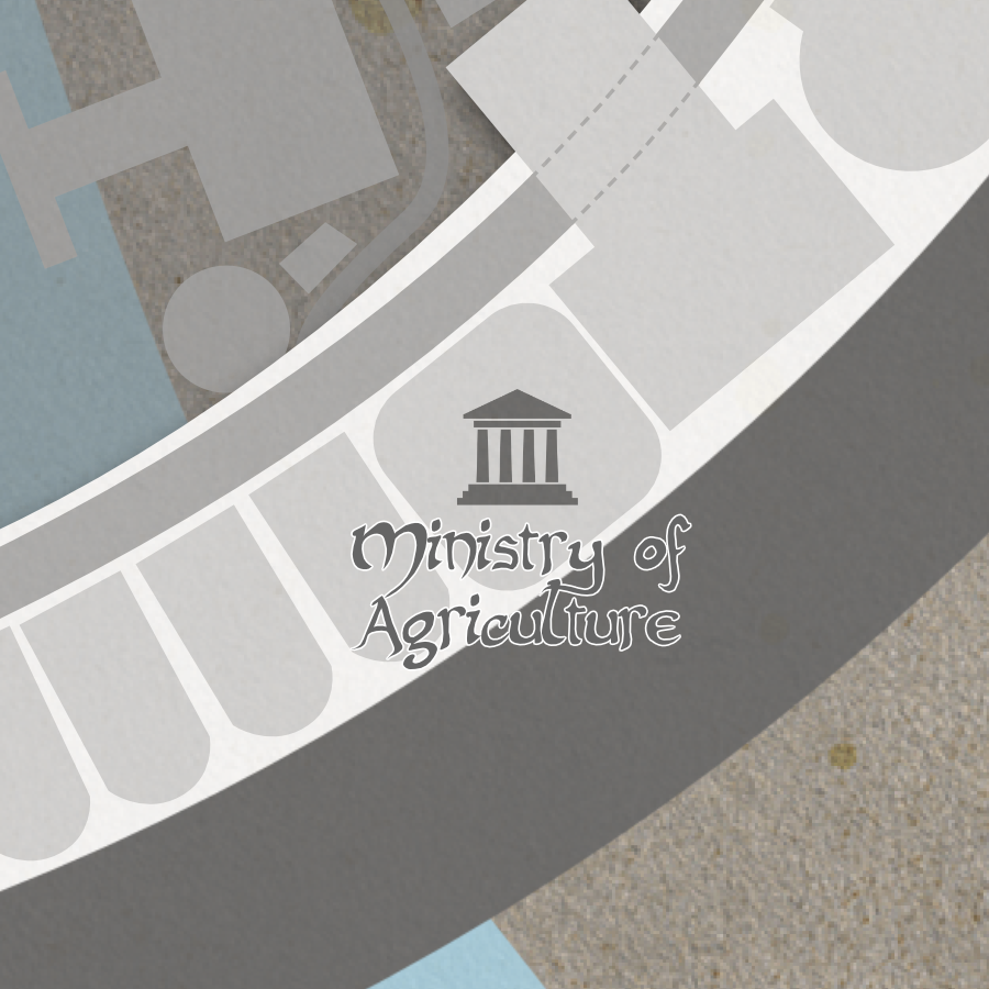 The Ministry of Agriculture governs all aspects of The City’s naturally grown resources. This is primarily in the form of field crops, but also includes moss, mushroom, and fungus cultivation, and forestation for the purposes of lumber (though the harvesting and processing falls under the jurisdiction of the Ministry of Industry). It is also responsible for the preparation and distribution of food and medical goods to appropriate departments, such as the Ministry of Health, Care, and Children.