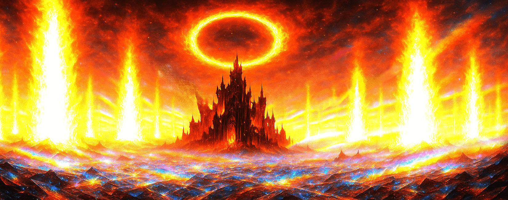 A vast wasteland filled with glass shards, jagged and razor-edged, that reflect the realm’s destructive brilliance. The waste is spotted with pits from which bright white light bursts constantly; this light is refracted by the shards, creating deceptively beautiful rainbows. Standing still for more than a few moments will cause severe burns, as the light is focused virtually everywhere.Fortress of the Pyrophant
