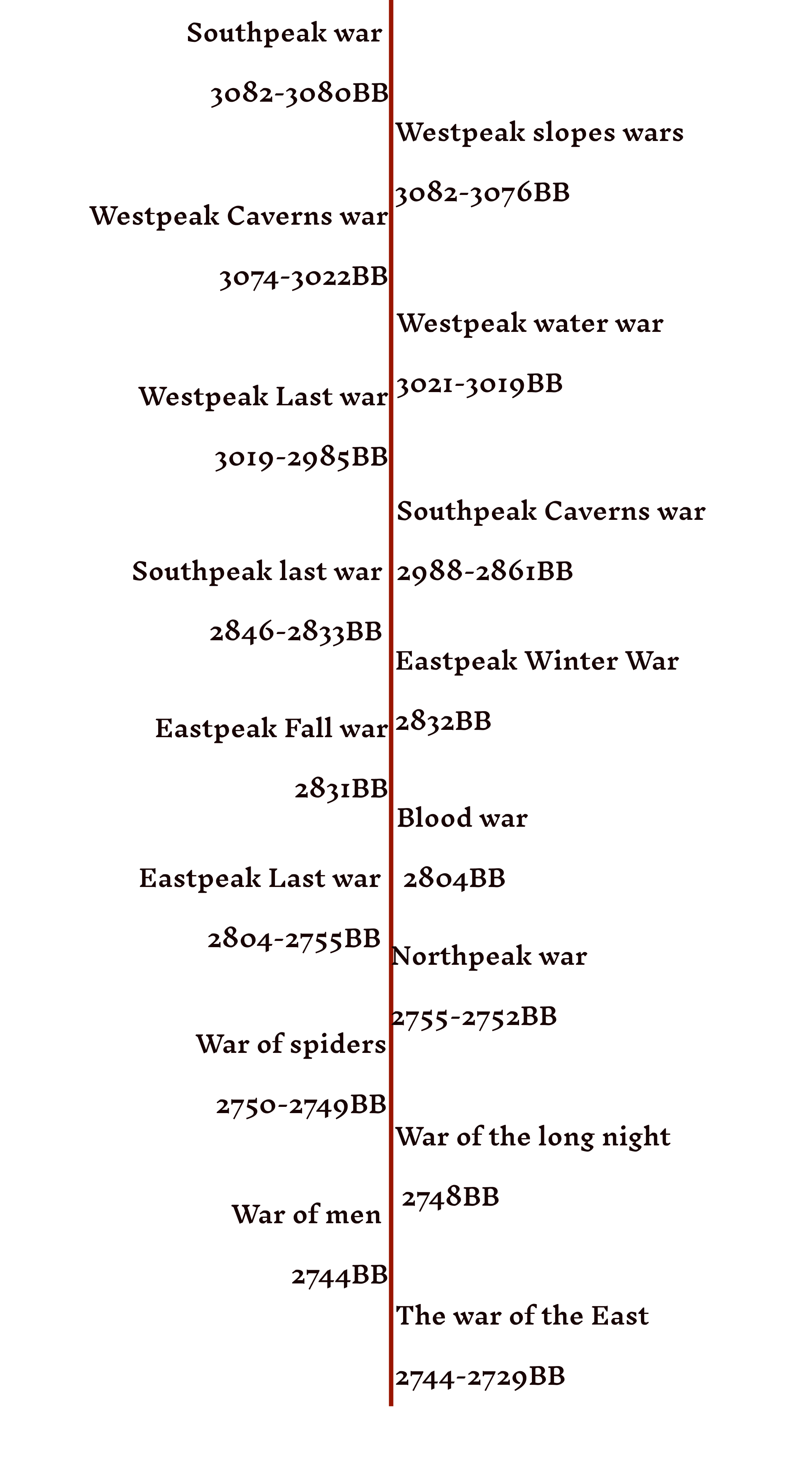 - 16. War of men - After the fall of both house Wegy and House Axilotheq, the matrons of both house Dizzijy and House Fygy had sent their sons to parley, the war ended with all the male heirs of both houses dead and the caverns in all of the four peaks in control of house Fygy