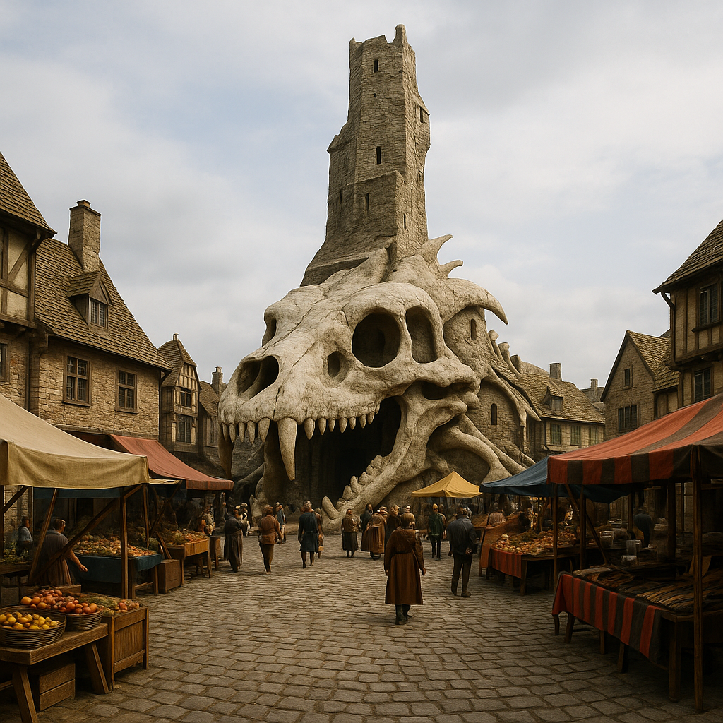 The area directly in front of that gaping maw is reserved for the guild market, which can be found every weekday from dawn until a few hours after noon, and at the weekend from mid-morning until dusk.