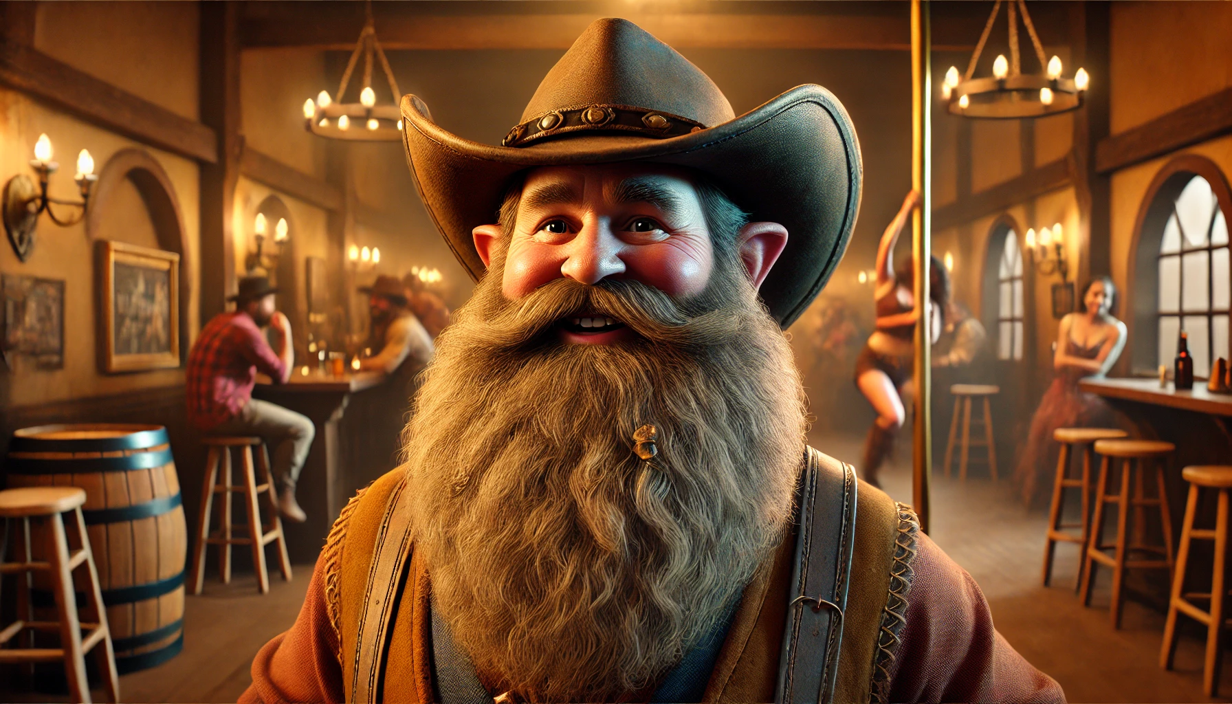 1,38m Groß, ganz haarig aber eine Glatze mit langen Bart mit Cowboyhut Poledancestange als Waffe Tanzt an Stange für Gäste, gibt auch private Sessions an der Tanzstange in seinem Zimmer. Stiftet Gäste zum Feiern und zu tanzen an &sorgt für gute Laune