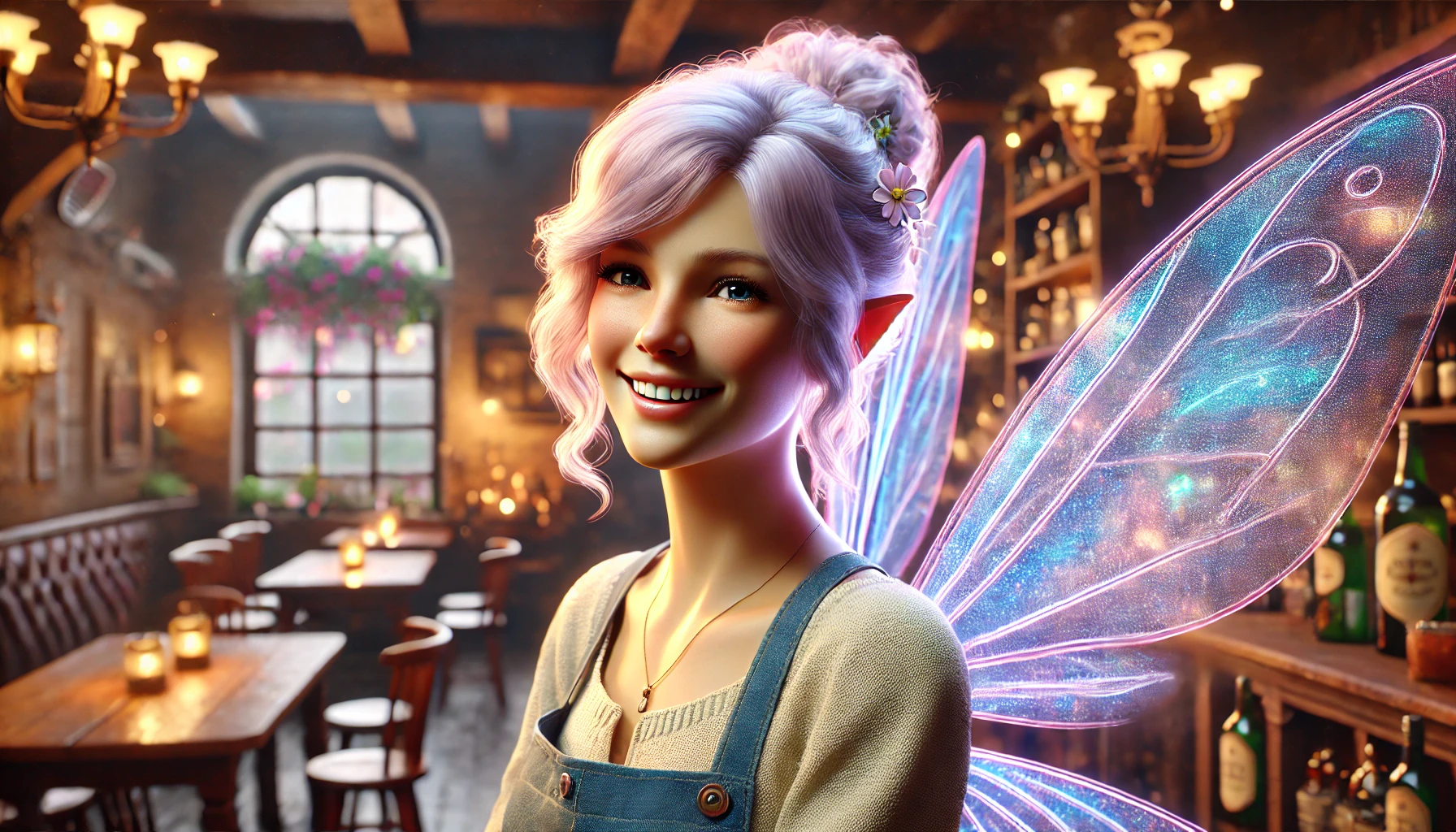Fröhlich, versucht Gäste glücklich zu machen. Kocht auch, weswegen die Gerichte klein ausfallen, dafür Liebe zum Detail. Als Bedienung kann Sie meistens nur Shots bringen, außer sie verwandelt sich zum Menschen, geht aber nicht so oft. Mit Tochen liiert.