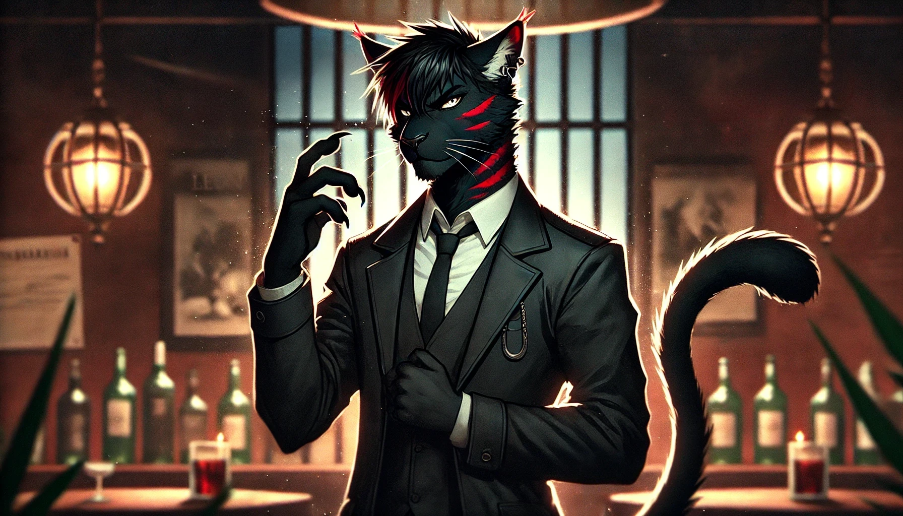 Eine klaue ist Schwarz, Schwarzes Fell mit roten Akzenten Ist für die Sicherheit und für die Buchhaltung verantwortlich. Hat in seinem Zimmer ein Kratzbaum stehen