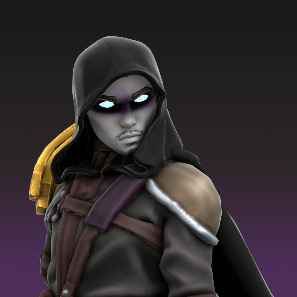 Aasimar with thick slicked back raven black hair, white skin, and bright glowing light blue eyes. He has black and dark purple paint across his eyes to imitate a mask and a well trimmed goatee. He wears black leather clothes with various leather straps and pockets, as well as a black cloak.