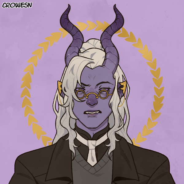 Asmeus is a lilac colored Tiefling that has dark grey eyes with gold pince-nez that he often looks over, he has long slightly wavy horns that darken towards the points. He has long white wavy hair some of which he always keeps up in a bun and the rest is always down. He wears a sharp black dress jacket over a sweater gray vest under that is a black suit and white tie, fitted black pants and clean black shoes. Asmeus is a pathetic little man who only cares about furthering his own goals. A spoiled brat who can't even open a door by himself without whining to several people about how incompetent they are. He thinks he is above everyone and everything else and the thought of him being told no is incomprehensible.Backstory