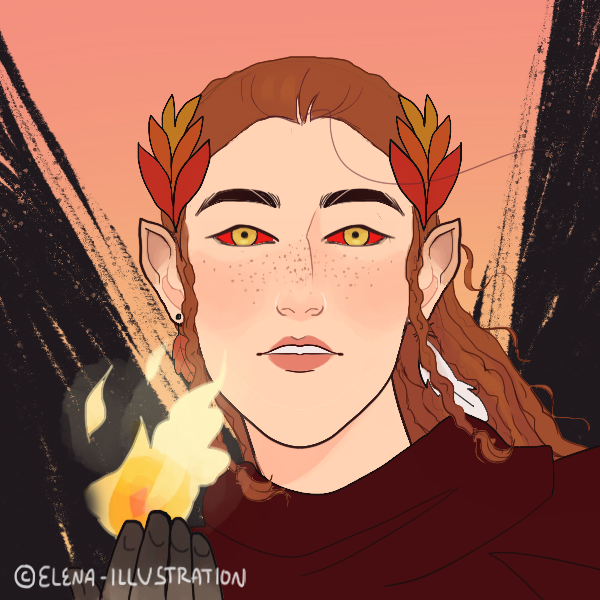 Calliandra has tan orange skin and long braided ginger hair with a leaf laurel atop their head of various colors. They wear very few clothes because they constantly get burnt off, only wearing a burnt black cape and red leather pants. Their fingernails, toenails, and feet are constantly dirty with ash. Calliandra is very stoic and almost emotionless when it comes to most things except fire. When it comes to fire, Calli shows great love, respect, and admiration almost like a beloved family pet.Backstory