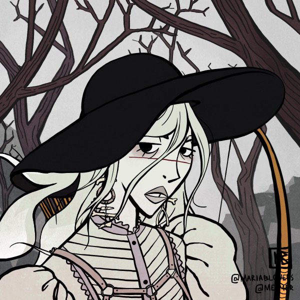 Dha’lliya is a wood Elf, level 6 college of spirits Bard. They are tall and willowy, a little over six feet tall and rail thin. They seem oddly ghostly despite being perfectly solid: not only do they have a natural silence to their movement, but everything about them appears faded, as though someone turned the saturation way down on a photograph. Skin and hair that obviously used to be vibrant and colorful are now muted and pale. Her eyes are a lusterless gold, and don’t appear to reflect light correctly. Large pointed ears droop on either side of their head. Their two front teeth stick out ever-so slightly. There is a long scar across her face, beginning from her right cheek and ending just under her left eye. You’ll never see them without their large black hat, wide-brimmed and adorned with a preserved daffodil. Dha’lliya is a very distant person, never fully in the present. They often speak to people who don’t appear to be there, or ignore conversations happening around them entirely in favor of listening to something no one else can hear. Her expressions are often half-hearted: only the smallest of smiles and the slightest of frowns can be seen on her lips. That’s not to say they aren’t friendly – in fact they’re very kind, generous to a fault, and often blind to the faults of those they care about. They just aren’t especially warm or proactive in their friendships.Backstory