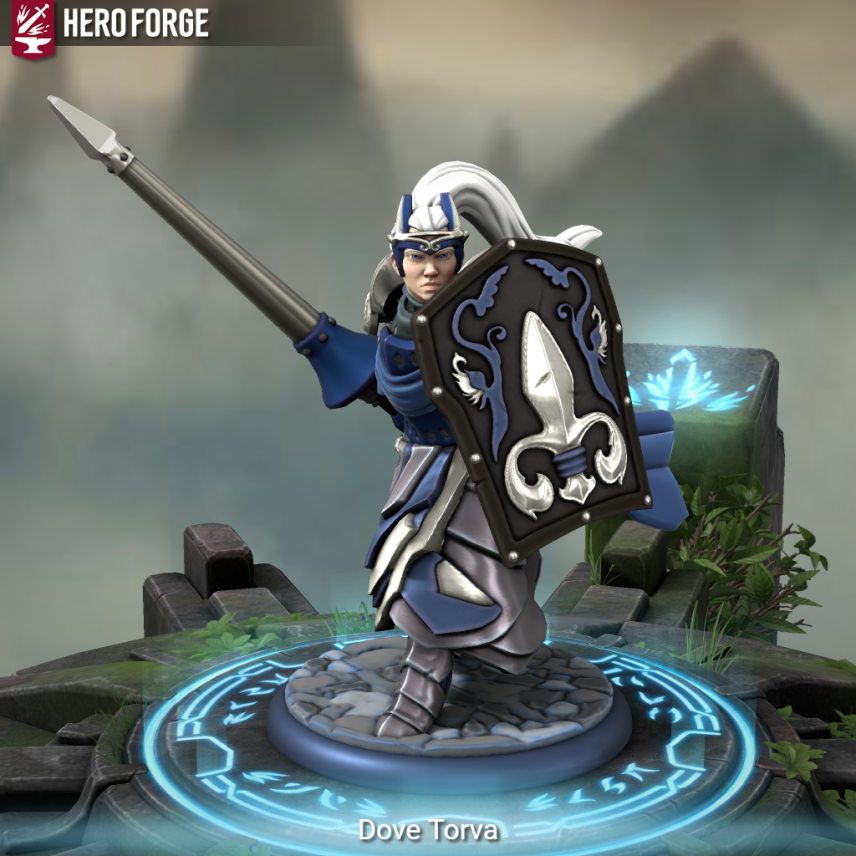 Dove is 5'4 and has long white hair that is in a high ponytail that goes down to the small of her back. She sports a color palette of blues, gray, and silver and wears full plate armor that goes into a full plate dress. She wields a lance and a shield with a grieving face on it and always has a kinda smile on.