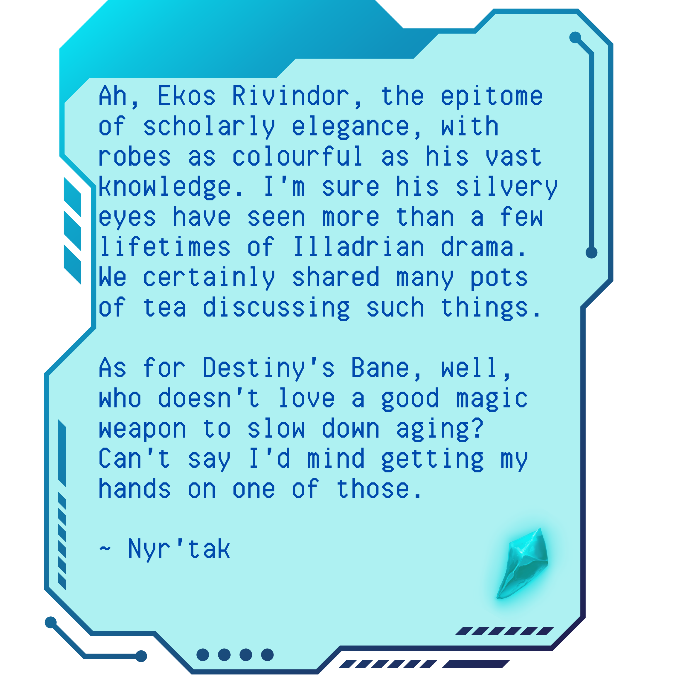 While a prominent public figure, Ekos led a mysterious life, living far beyond the standard half-century lifespan of an Illadrian. This was due in part to his possession of the legendary weapon, Destiny's Bane which grants its wielder a greatly decelerated aging process.