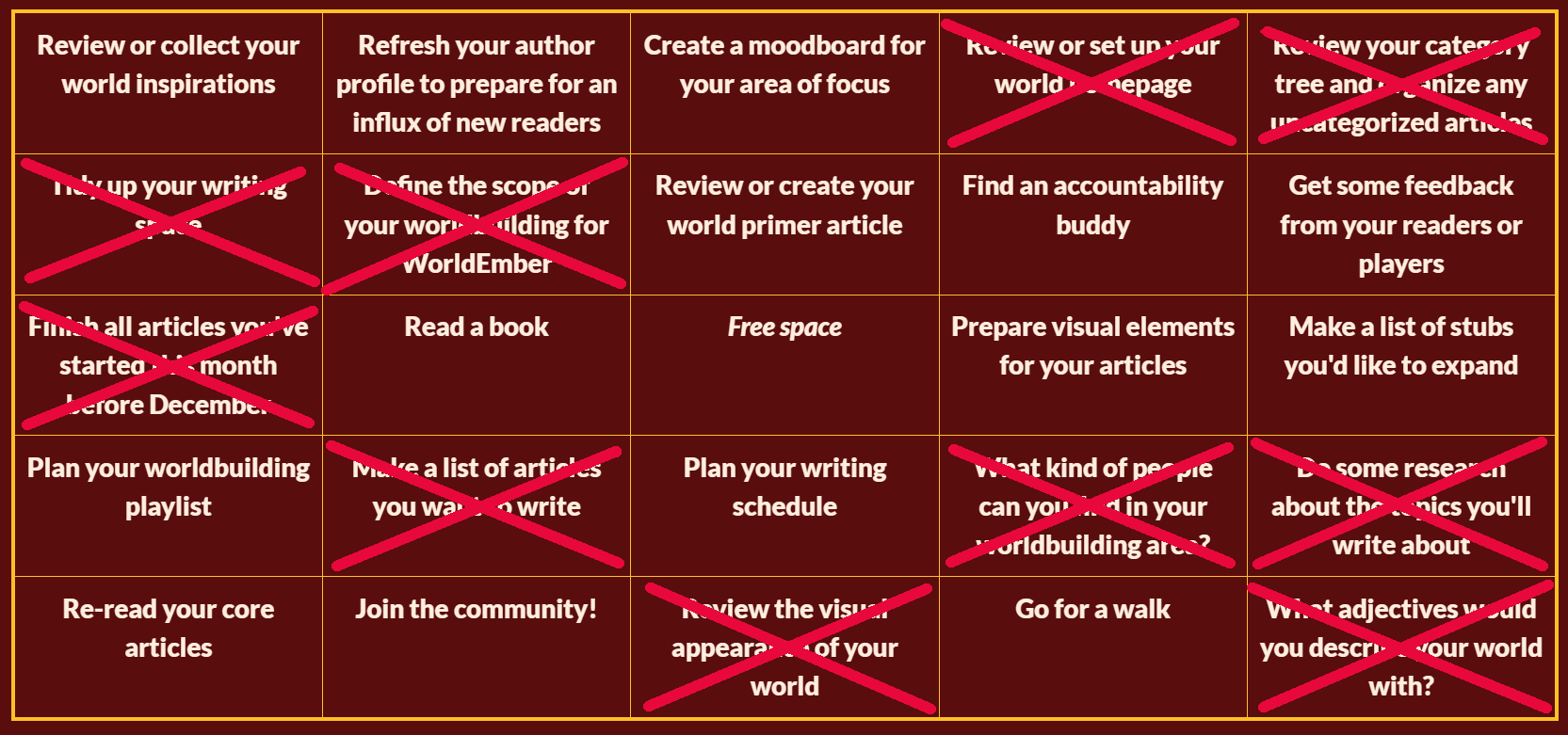 I have review the category tree and organized uncategorized articles, excepting some articles which are meant not to be available to players yet. I have reviews my world page and the heading used for the various page types in my world. I finished up existing articles, or will have them finished by Dec 1. I have made a list of articles I want to complete in December as part of WorldEmber.