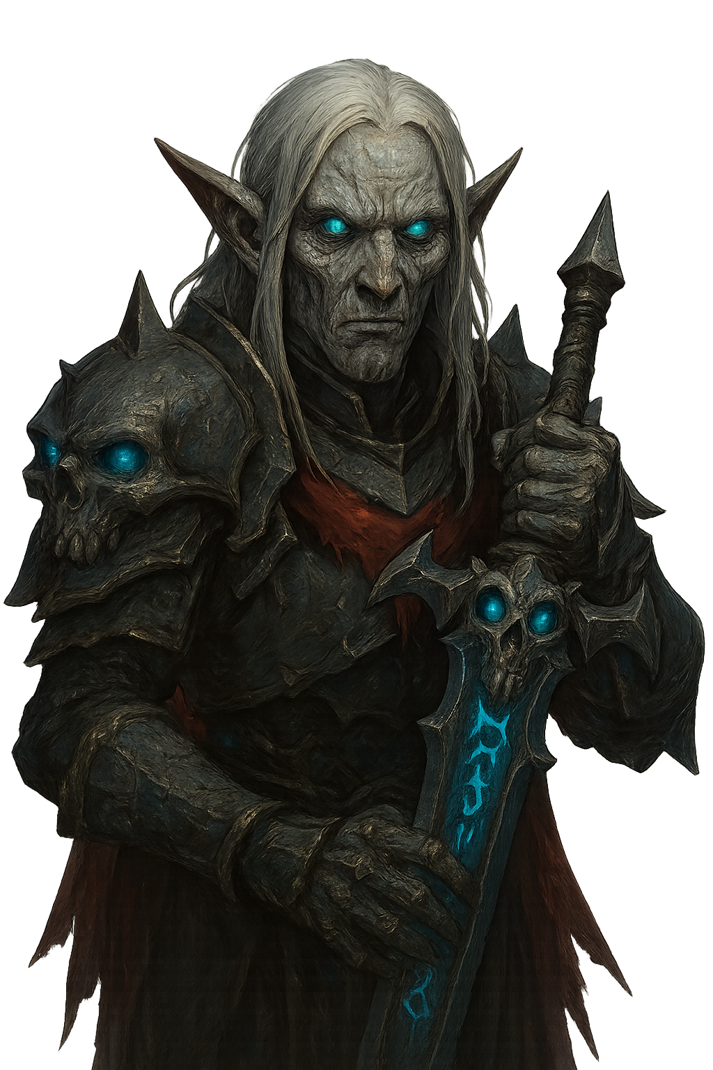Born a mortal knight, Kas rose to become Vecna’s most trusted lieutenant during the conquest of Lorien. At the Siege of Lethis, Kas commanded necromancers in raising colossal undead war engines from the lake’s depths, breaking the capital’s defenses. Vecna rewarded his loyalty by transforming him into a death knight and forging the Sword of Kas.