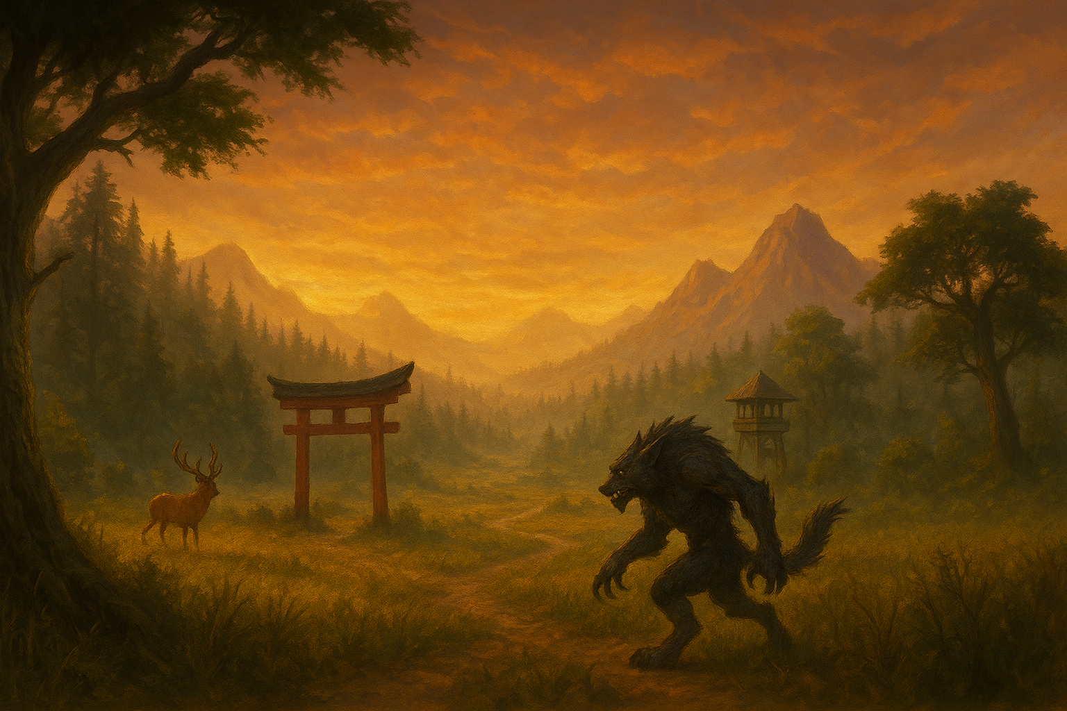 Buildings are scarce, yet not unknown. Weathered torii gates stand alone in the forest, marking paths to sacred glades where the trees twist into shapes like crouched predators. Bamboo watchtowers, unmanned yet never empty, overlook game trails. No village lasts long—nature reclaims all—but travelers speak of finding lonely tea houses deep in the woods, where the host vanishes if you blink.