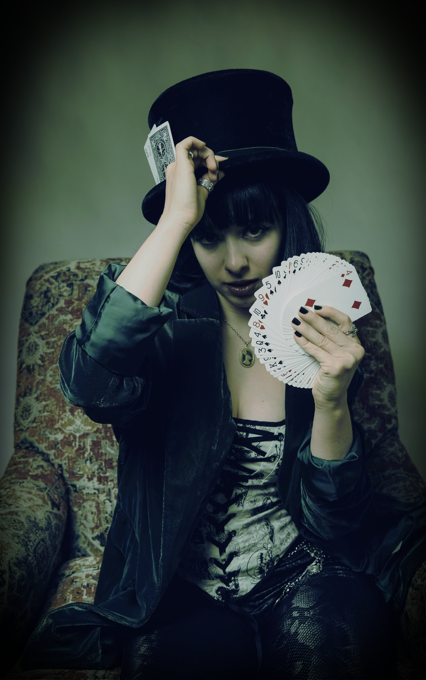 She carries a small train case with a few memories. Her only useful items are a deck of Tarot cards and a small set of lock-picking tools she keeps secreted about herself.