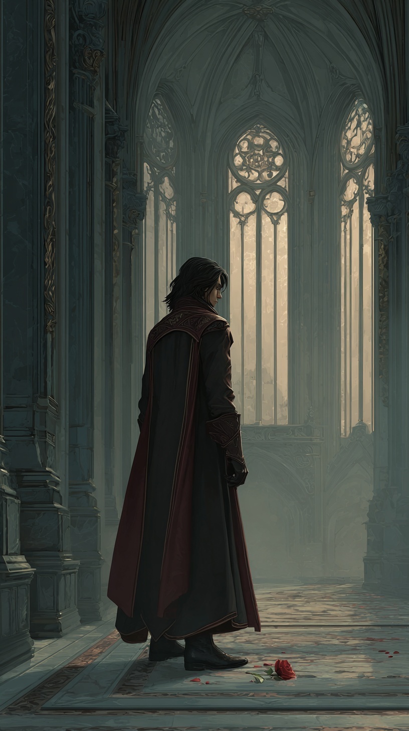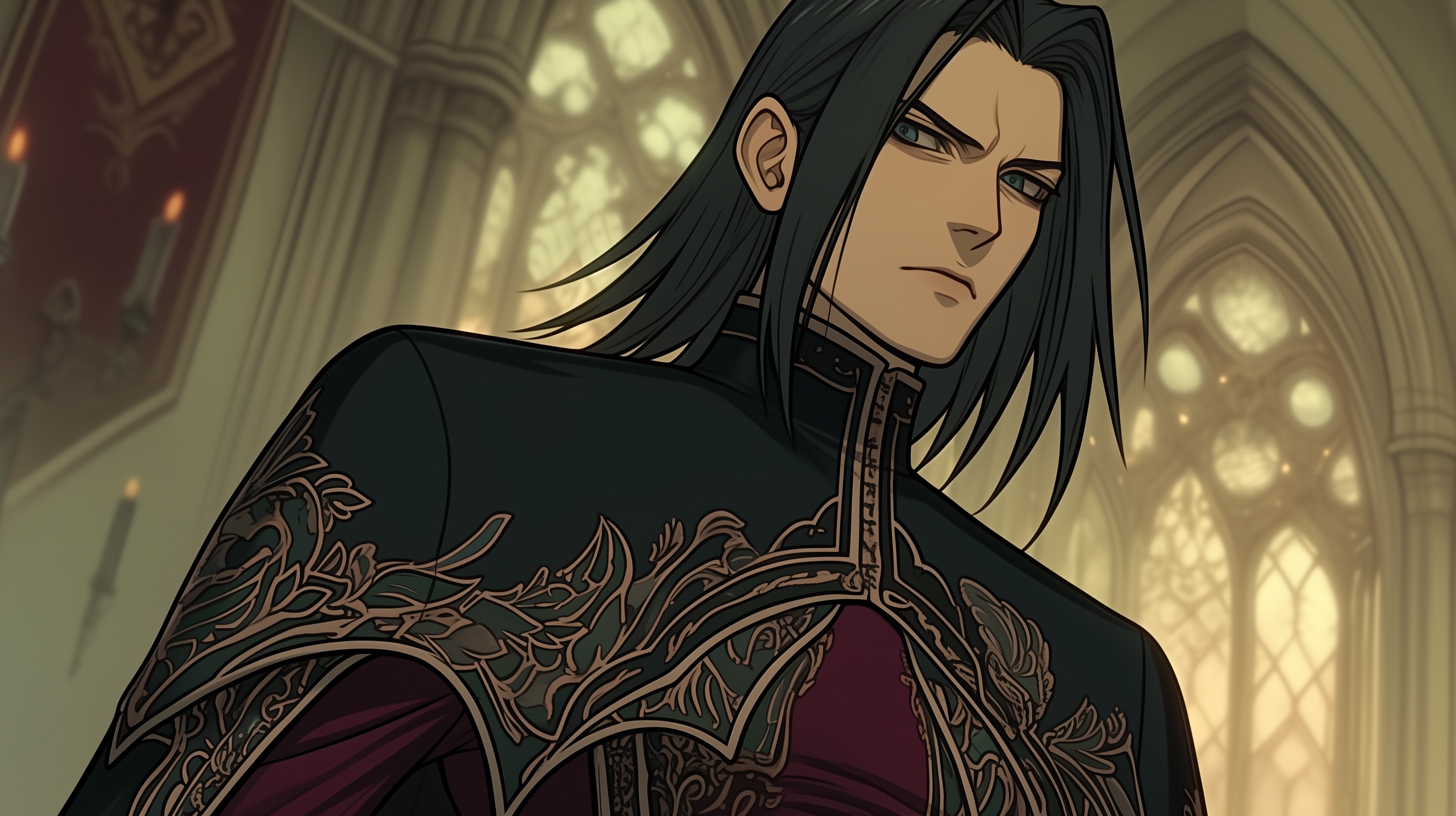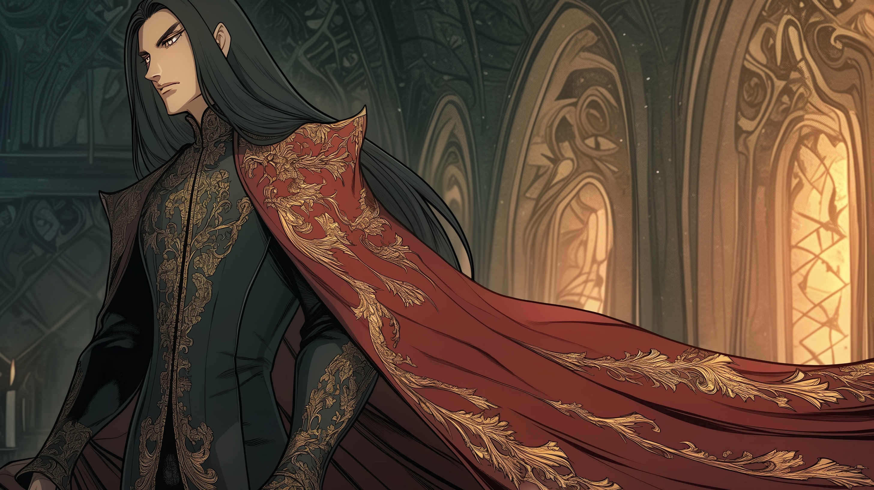 Even his boots, polished to a quiet sheen, speak of his discipline. He walks not only through stone halls but through memory, unwilling to allow a single mark to disturb the impression of permanence. His appearance is not for vanity. It is a statement. I am in control. Of myself. Of you. Of everything.