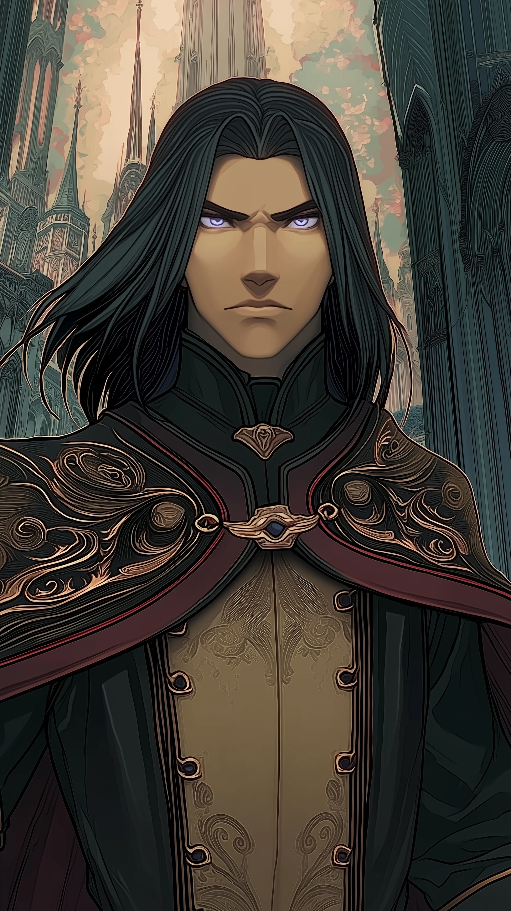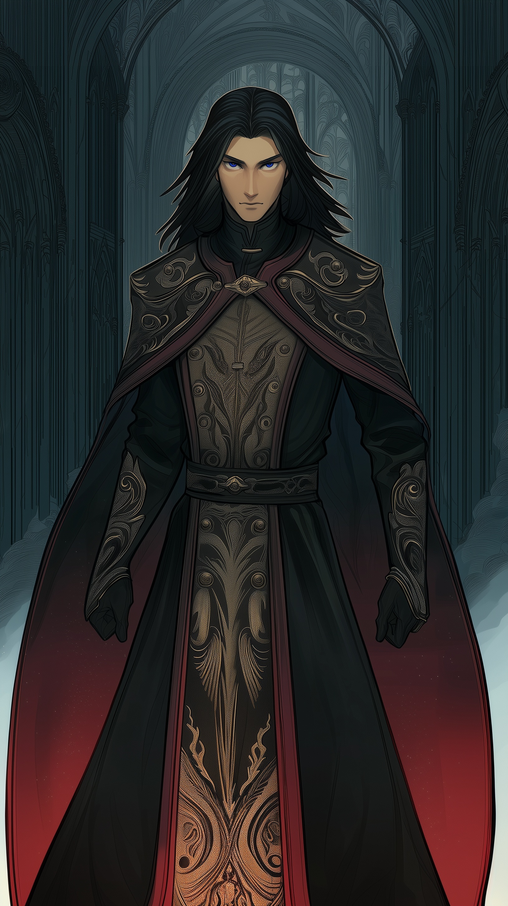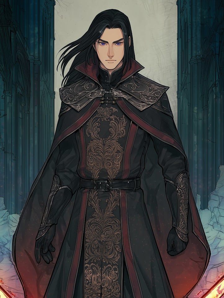 Corvyn Seinrill’s most striking feature is his eyes. Dark orchid in color, they appear subdued in shadow but take on a near luminescence when caught by the light. These are not the eyes of a man who only observes. They belong to someone who analyzes, remembers, and never forgets. His gaze is not cruel and not cold, but unflinching. It gives the impression that every hesitation, every falsehood, has already been measured before the other person realizes they have spoken.