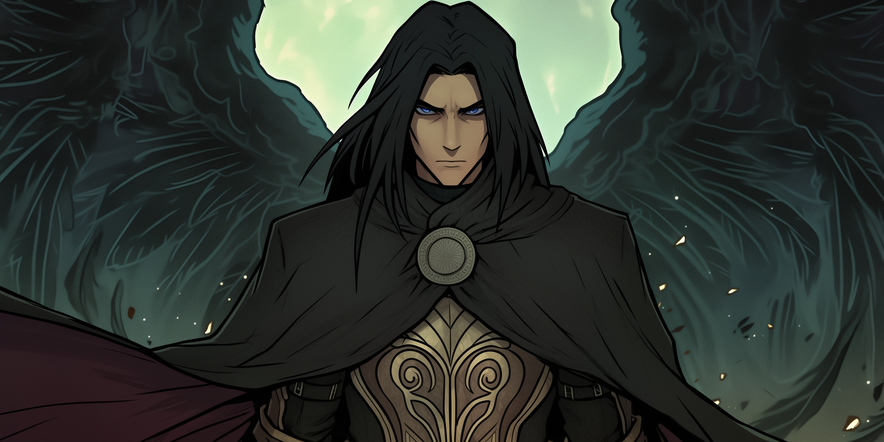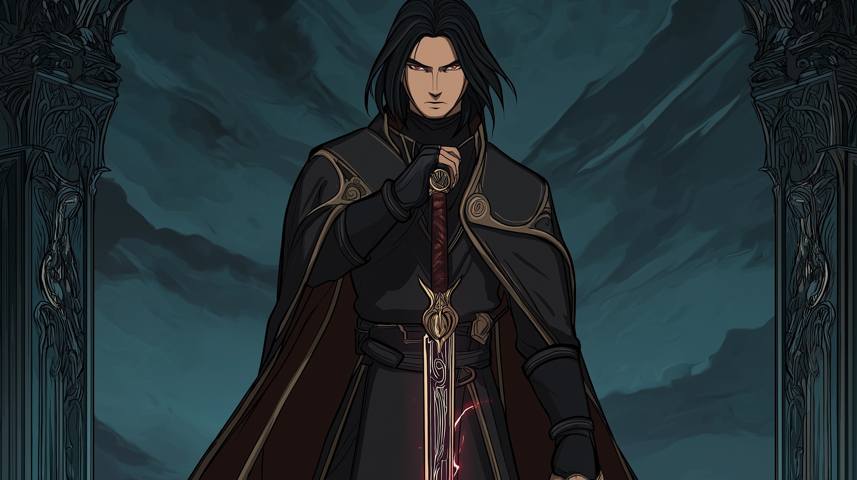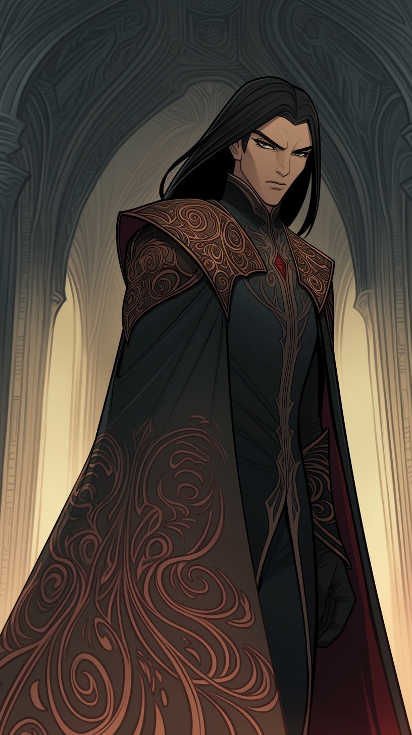 Corvyn Seinrill’s most striking feature is his eyes. Dark orchid in color, they appear subdued in shadow but take on a near luminescence when caught by the light. These are not the eyes of a man who only observes. They belong to someone who analyzes, remembers, and never forgets. His gaze is not cruel and not cold, but unflinching. It gives the impression that every hesitation, every falsehood, has already been measured before the other person realizes they have spoken.