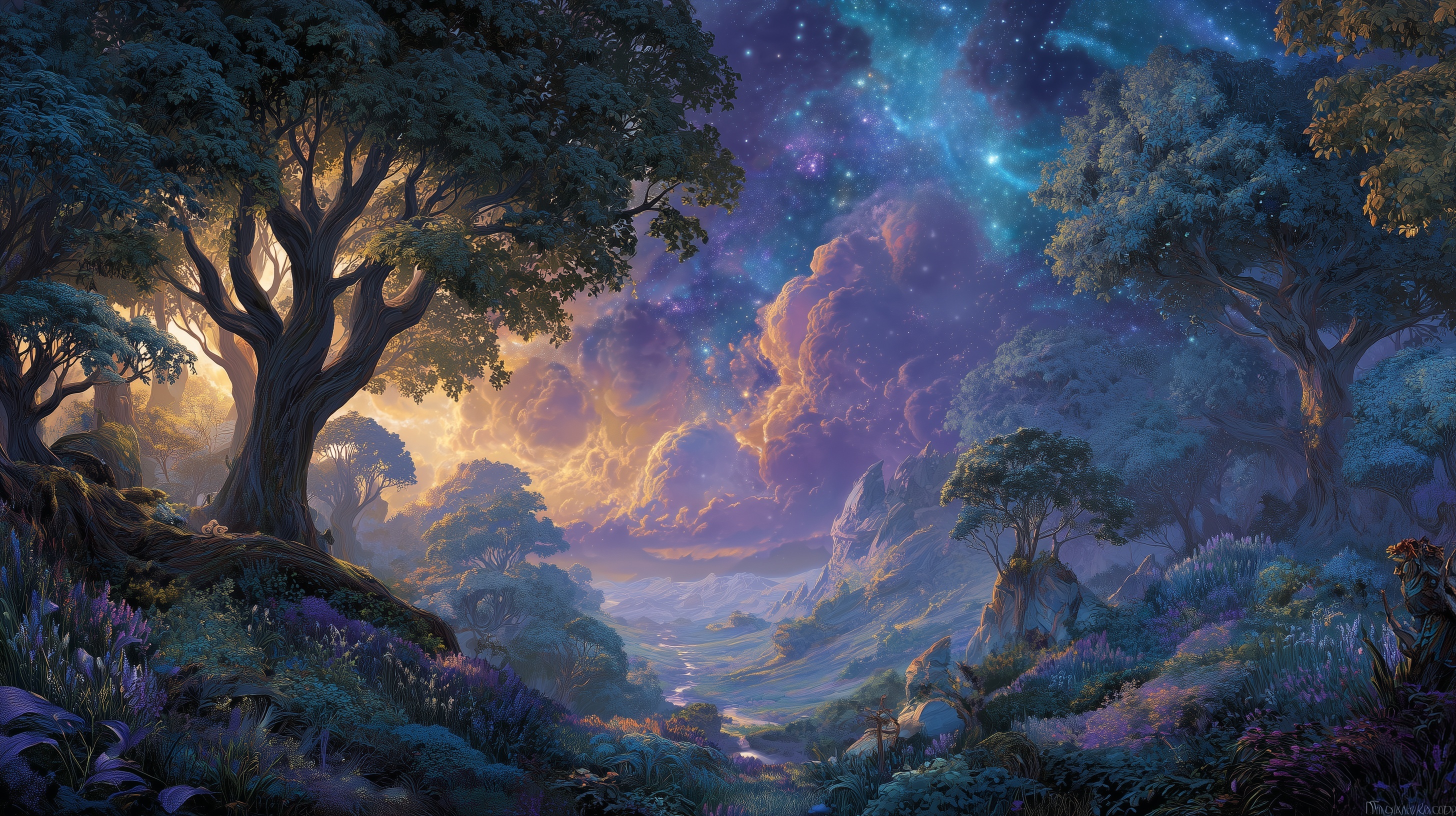 The plane is dominated by great natural expanses. Endless forests stretch between massive rivers and towering mountain ranges. Trees grow wider than cities. Flowers bloom in colors that do not exist on the Prime Material Plane. The land itself feels alive. Animals speak with their eyes. The wind hums with distant voices. The sky shifts with the emotions of those beneath it. Travelers may find themselves walking through summer, then winter, then twilight, all within the same day.