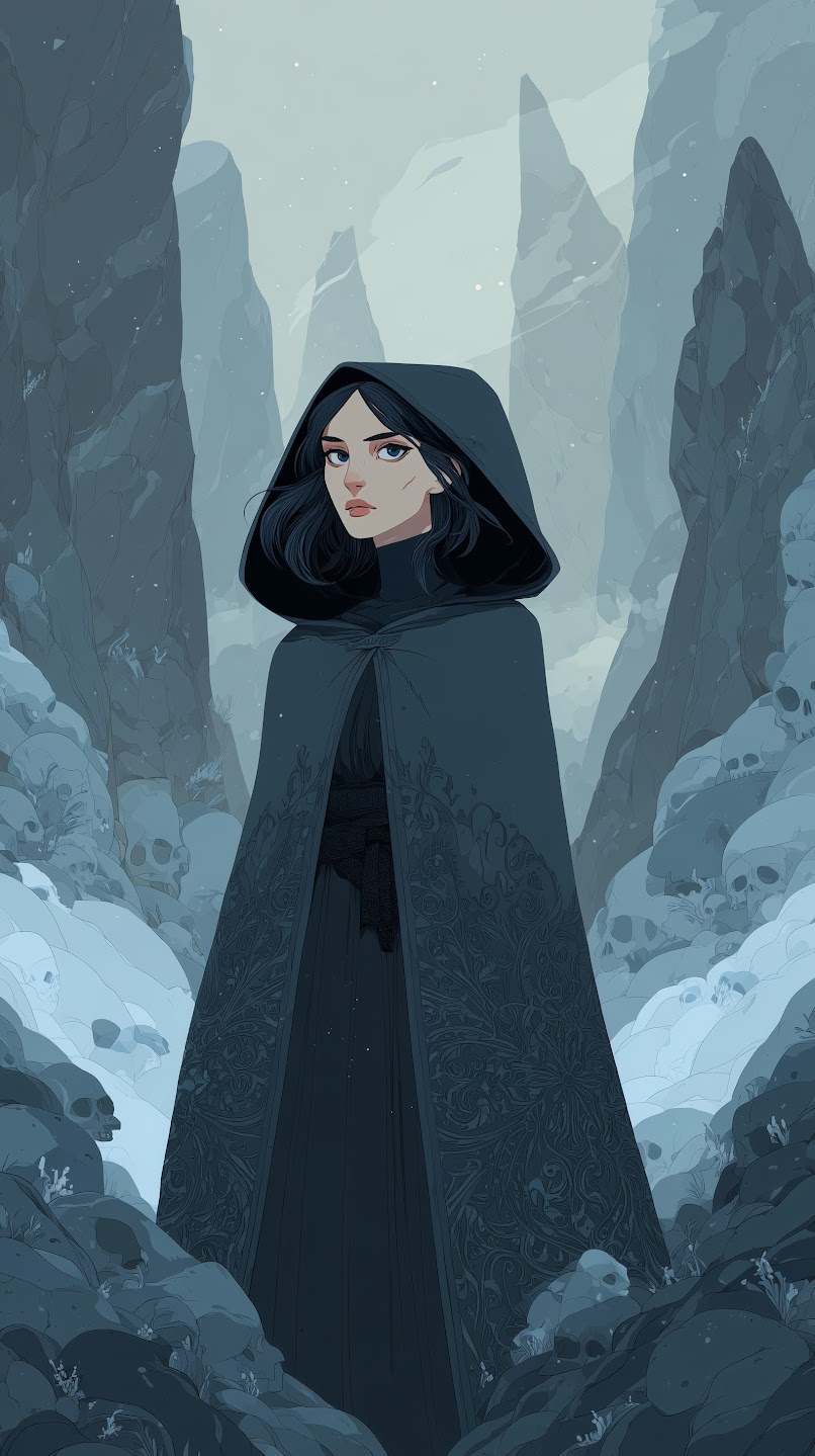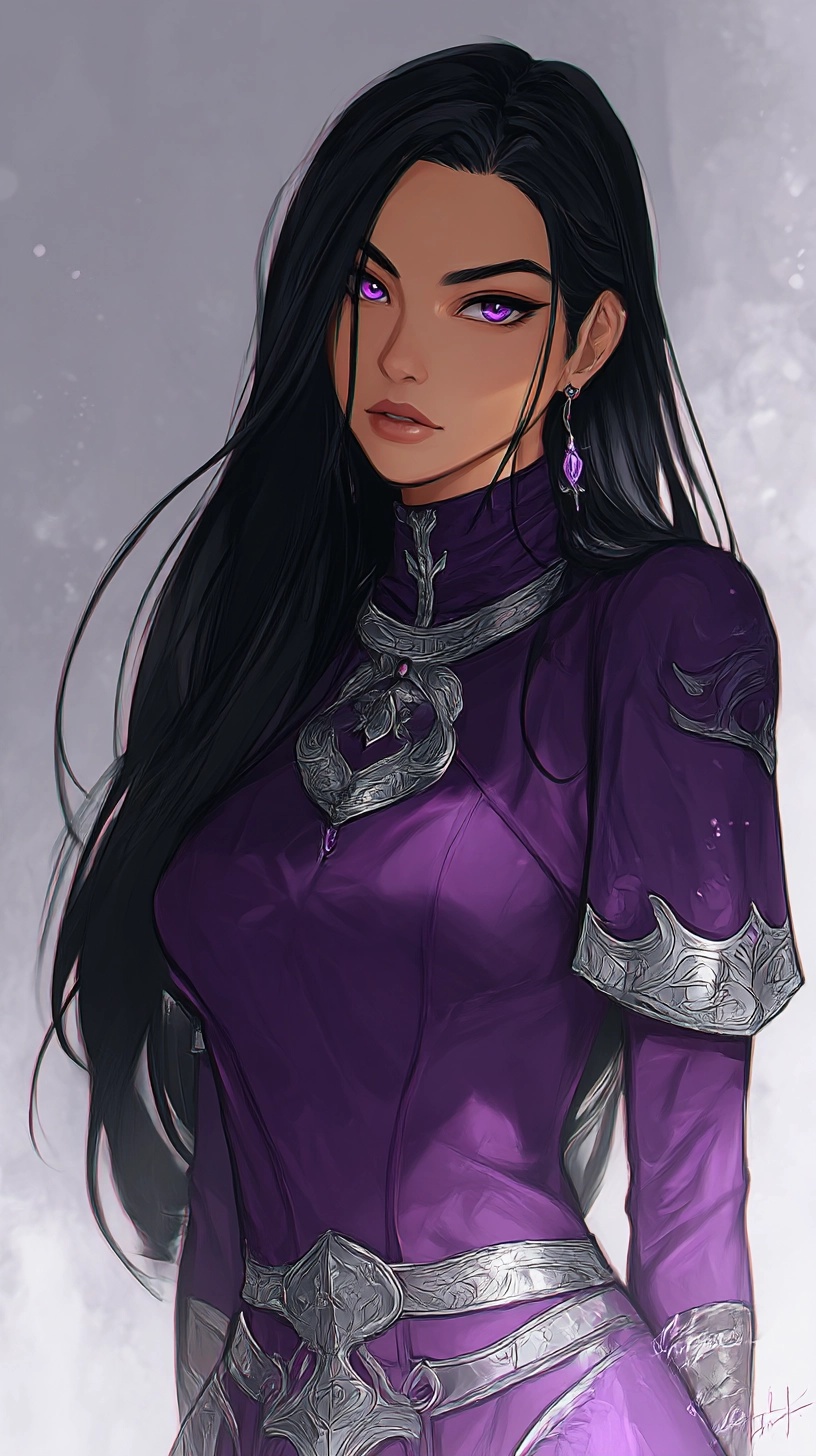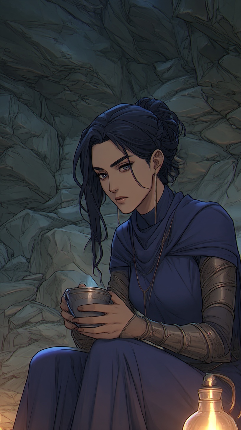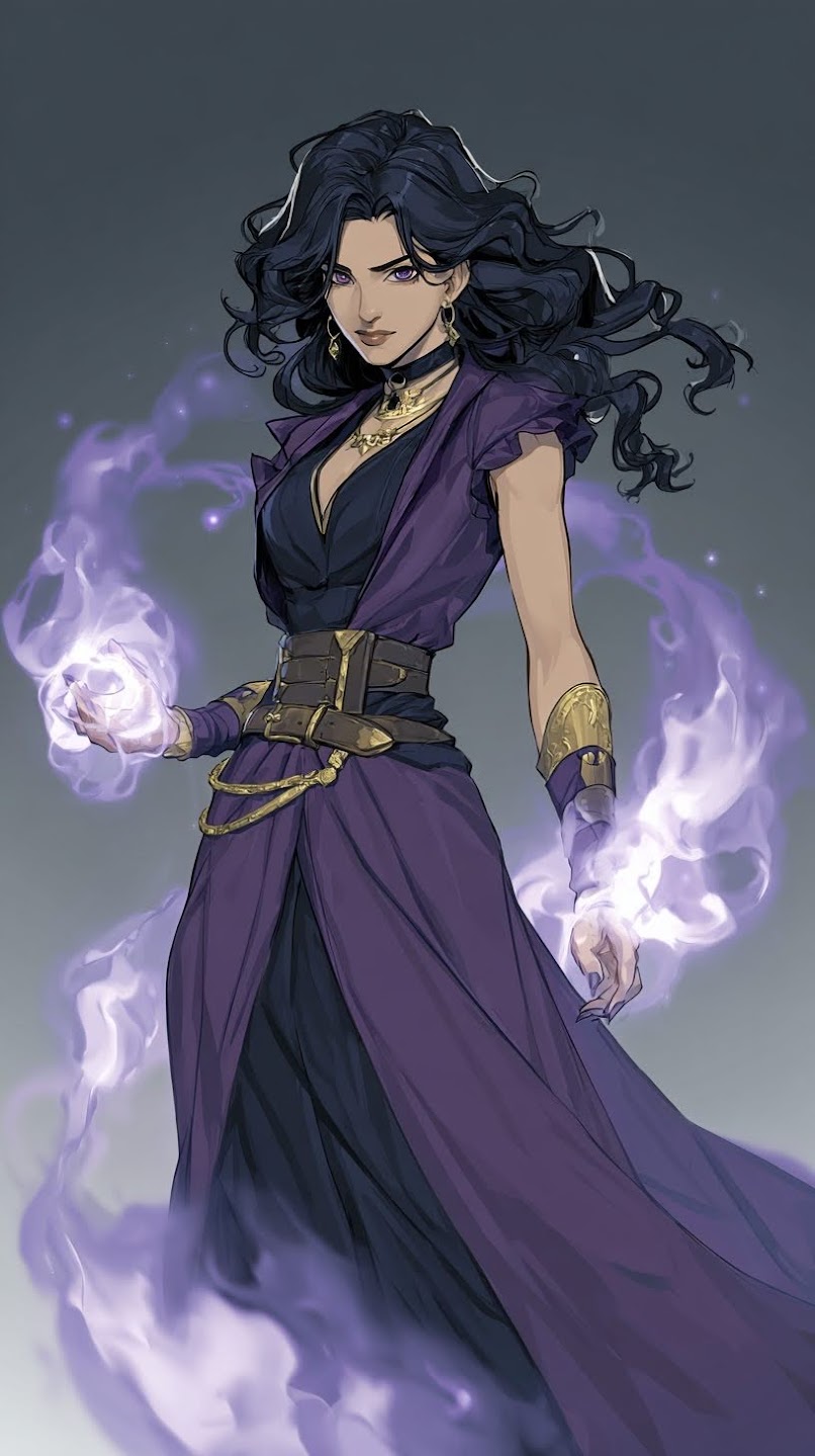 Cassandra’s presence is defined first by contrast. She carries the physical stillness of someone trained to disappear and the striking beauty of someone impossible to overlook. Her features echo both parents but never in equal measure. Her hair is a deep, midnight black that catches light with a soft sheen, usually worn loose or pushed back with casual elegance that suggests she never needs to fuss with it to make it fall perfectly. Her skin holds a warm undertone that contrasts sharply with the brilliance of her eyes, giving her an appearance that feels both inviting and untouchable. Her eyes are her most unmistakable feature. The same blue orchid shade that marked Corvyn in his youth lives in her gaze, bright and piercing in a way that stops conversation mid breath. They reveal her mood in subtle shifts. When she is thoughtful they soften. When she is working they narrow with calculating clarity. When she is nervous they flicker with the smallest tremor of uncertainty. People often underestimate how expressive those eyes are because her face is otherwise composed. They are windows into the quiet storm she carries beneath her calm exterior. Cassandra’s build reflects a lifetime of disciplined movement rather than brute training. She stands with a natural grace that comes from understanding her body as both tool and terrain. Her frame is lean, athletic, and balanced, shaped for speed, stealth, and agility instead of raw strength. Every gesture flows smoothly into the next, even when she is not conscious of it. She rarely raises her voice or moves abruptly unless startled, and when she walks, her steps are light enough that people sometimes fail to hear her approach at all. Her beauty is the kind that grows more striking the longer one looks. At first glance she is simply a lovely woman with confident posture. Then the details begin to reveal themselves. The curve of her jaw softened by natural warmth. The slight tilt of her smile when she is thinking of something amusing. The long, dark lashes that give her shyness an almost regal softness. She does not dress to impress yet everything she wears seems to complement her shape effortlessly. Even in simple clothing she carries herself like someone fully aware of her effect on others but too modest to exploit it without reason. Small details complete the picture. A faint scar along her forearm from a mission gone wrong. The delicate shape of her hands, equally capable of casting intricate spells or carving small stone charms. The subtle tension that appears in her shoulders when she is startled by loud noise. The way she instinctively curls inward when overwhelmed and unfolds again when comforted. Her physical form tells the story of a woman who has lived in danger long enough to master it, yet retained enough softness to remain unmistakably herself.
