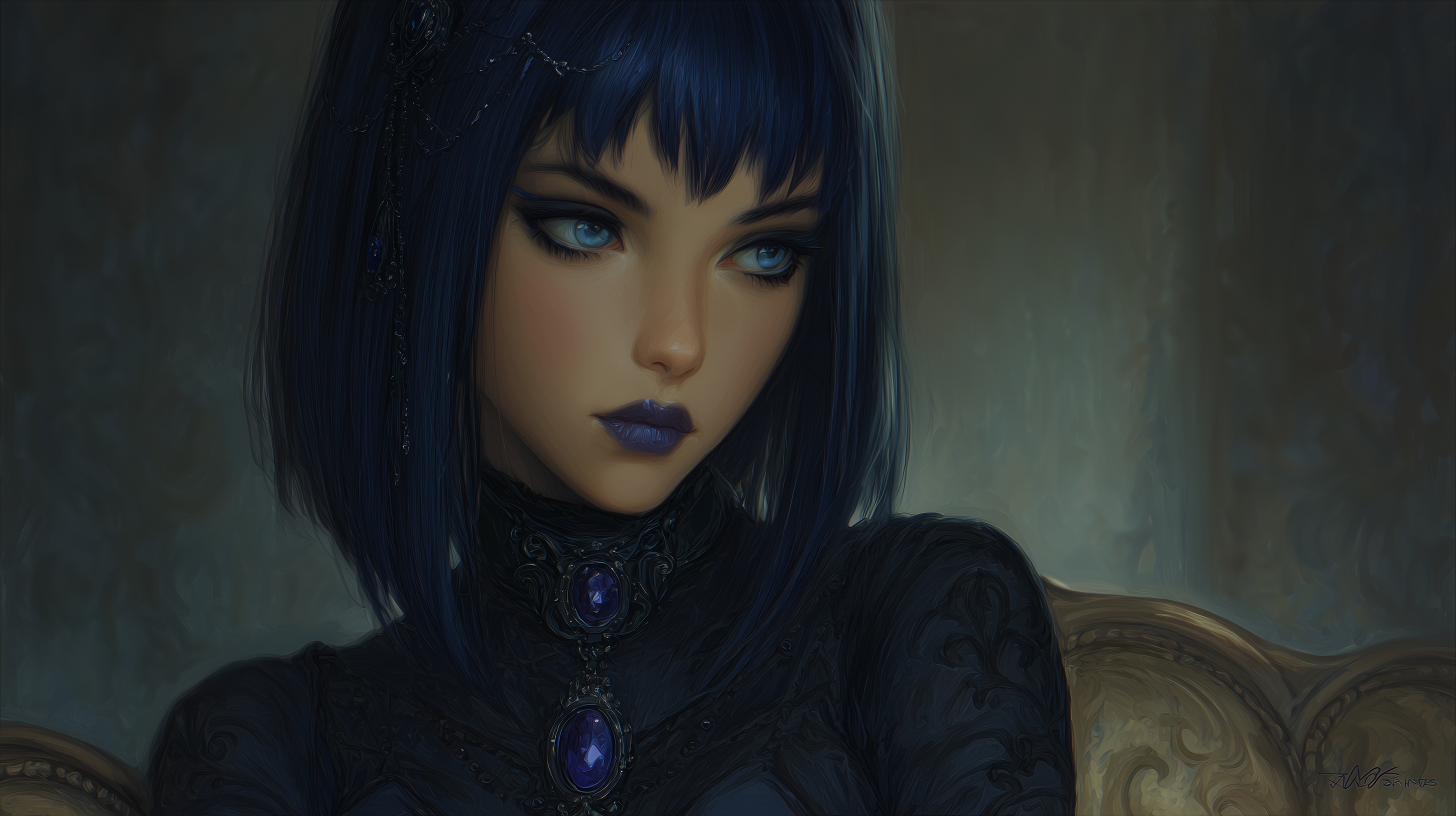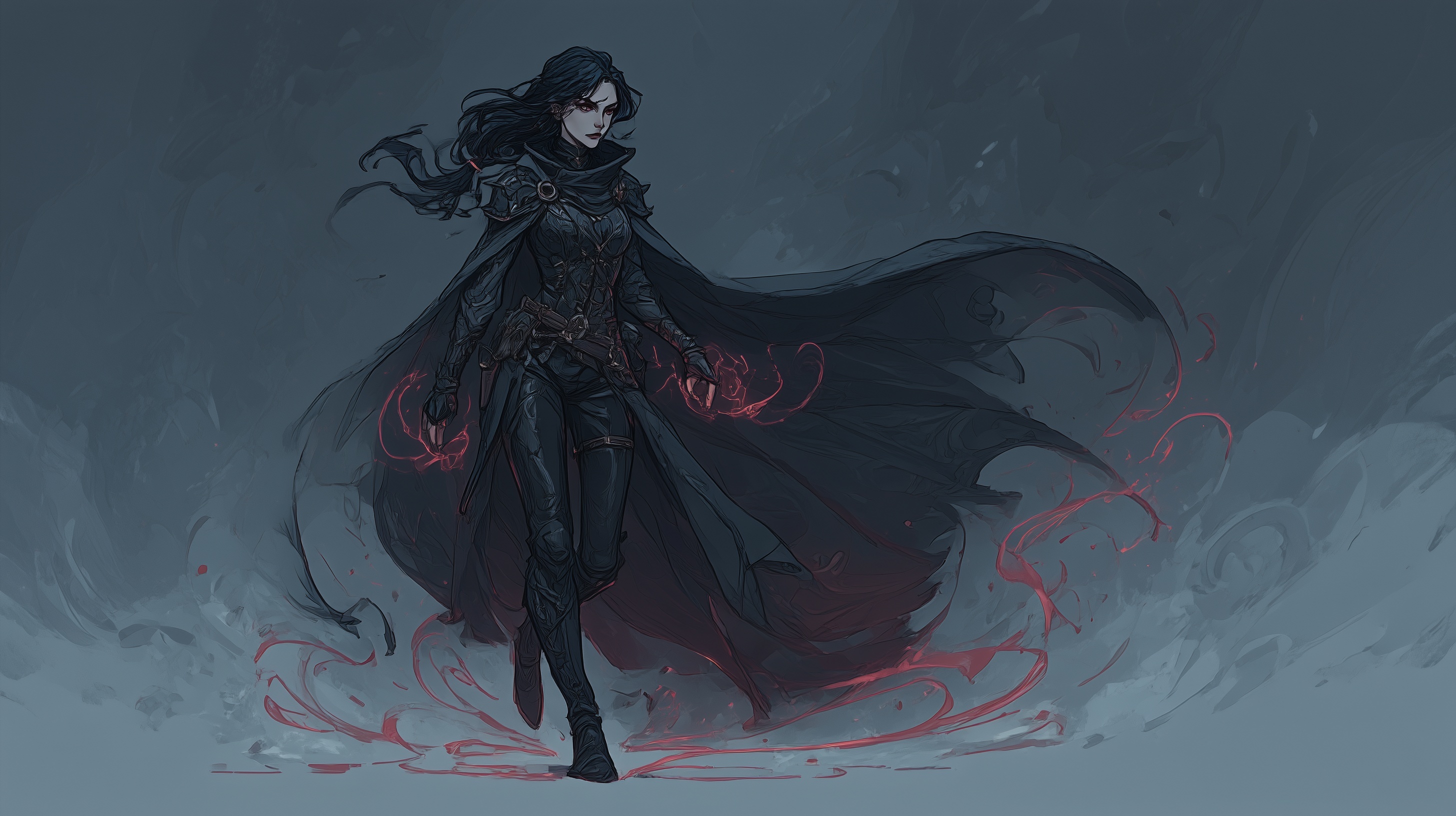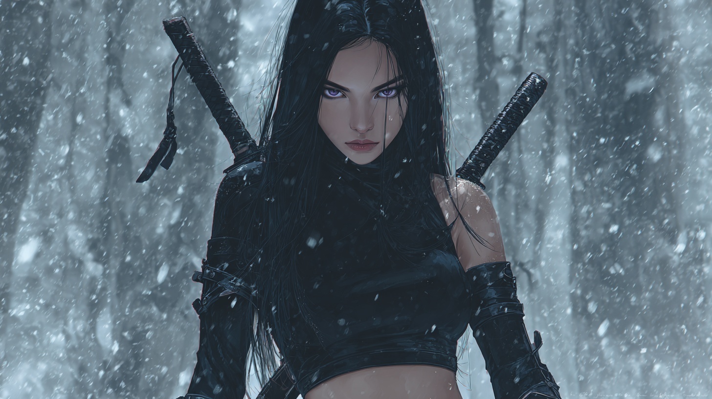Cassandra’s presence is defined first by contrast. She carries the physical stillness of someone trained to disappear and the striking beauty of someone impossible to overlook. Her features echo both parents but never in equal measure. Her hair is a deep, midnight black that catches light with a soft sheen, usually worn loose or pushed back with casual elegance that suggests she never needs to fuss with it to make it fall perfectly. Her skin holds a warm undertone that contrasts sharply with the brilliance of her eyes, giving her an appearance that feels both inviting and untouchable. Her eyes are her most unmistakable feature. The same blue orchid shade that marked Corvyn in his youth lives in her gaze, bright and piercing in a way that stops conversation mid breath. They reveal her mood in subtle shifts. When she is thoughtful they soften. When she is working they narrow with calculating clarity. When she is nervous they flicker with the smallest tremor of uncertainty. People often underestimate how expressive those eyes are because her face is otherwise composed. They are windows into the quiet storm she carries beneath her calm exterior. Cassandra’s build reflects a lifetime of disciplined movement rather than brute training. She stands with a natural grace that comes from understanding her body as both tool and terrain. Her frame is lean, athletic, and balanced, shaped for speed, stealth, and agility instead of raw strength. Every gesture flows smoothly into the next, even when she is not conscious of it. She rarely raises her voice or moves abruptly unless startled, and when she walks, her steps are light enough that people sometimes fail to hear her approach at all. Her beauty is the kind that grows more striking the longer one looks. At first glance she is simply a lovely woman with confident posture. Then the details begin to reveal themselves. The curve of her jaw softened by natural warmth. The slight tilt of her smile when she is thinking of something amusing. The long, dark lashes that give her shyness an almost regal softness. She does not dress to impress yet everything she wears seems to complement her shape effortlessly. Even in simple clothing she carries herself like someone fully aware of her effect on others but too modest to exploit it without reason. Small details complete the picture. A faint scar along her forearm from a mission gone wrong. The delicate shape of her hands, equally capable of casting intricate spells or carving small stone charms. The subtle tension that appears in her shoulders when she is startled by loud noise. The way she instinctively curls inward when overwhelmed and unfolds again when comforted. Her physical form tells the story of a woman who has lived in danger long enough to master it, yet retained enough softness to remain unmistakably herself.