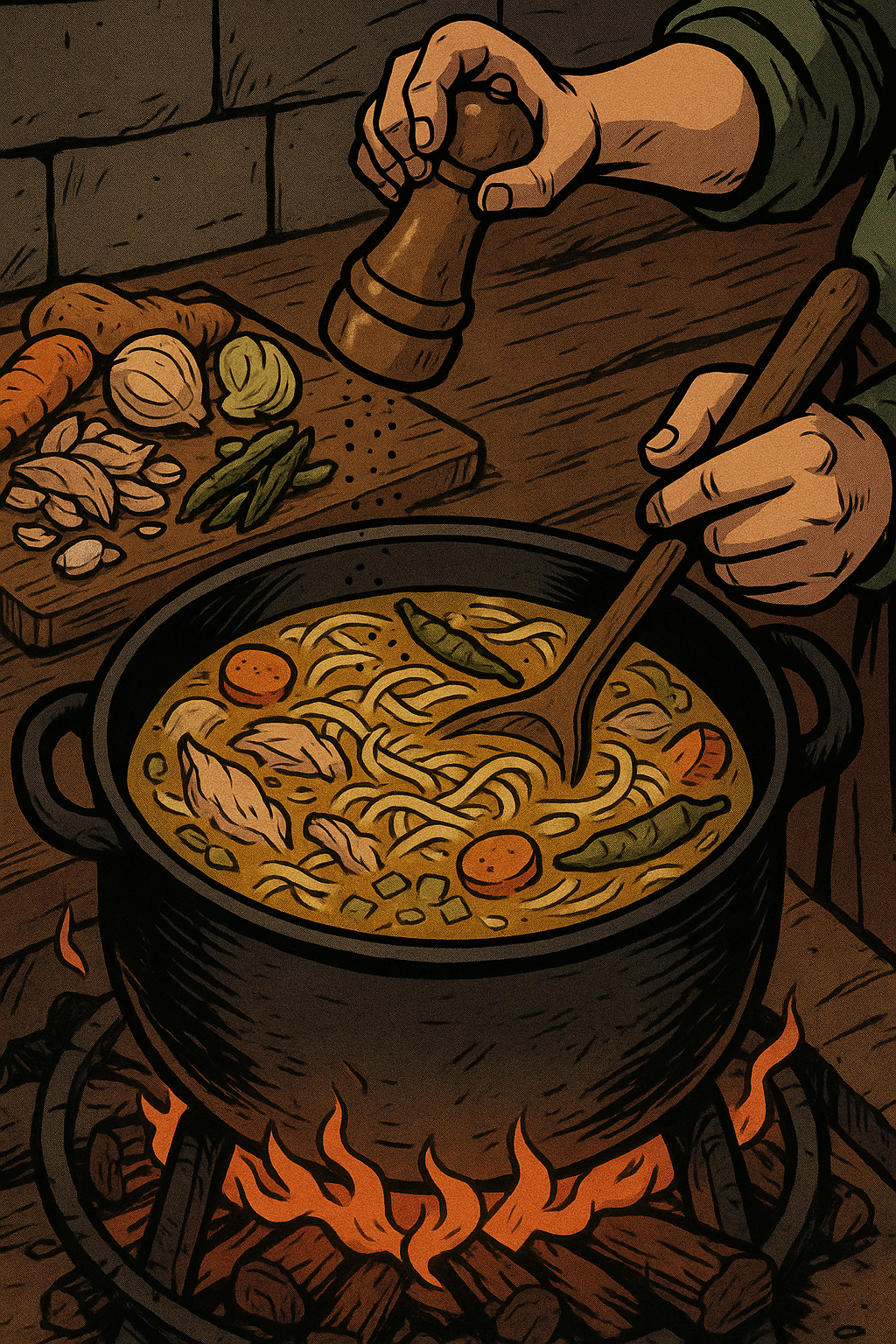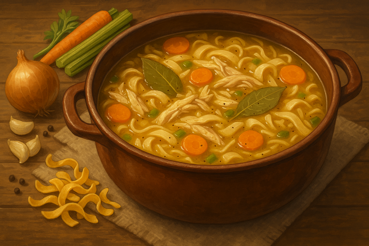 1. Set a large pot on the stove and put in the chicken with the stock or water and bouillon. Bring it to a steady boil and let it go for about one hour. Do not fuss with it. When the hour is up, lift out the chicken, pull the meat from the bones, and return only the meat to the pot. 2. Add the onion, celery, carrot, garlic, and long peppers. Let everything simmer until the vegetables soften and the broth tastes like it has settled into itself. 3. Boil the egg noodles in a separate pot until they are almost cooked. Drain them and put them into the soup. Season with salt and black pepper until it tastes right. Give it a few minutes off the heat to let the flavors come together. 4. Serve it hot. It is always better the next day, but it never lasts that long.“There are a hundred grand feasts in the mountains, but none of them bring a house to silence the way a pot of this soup does. When it’s on the fire, you know someone’s heart needed steadying.”