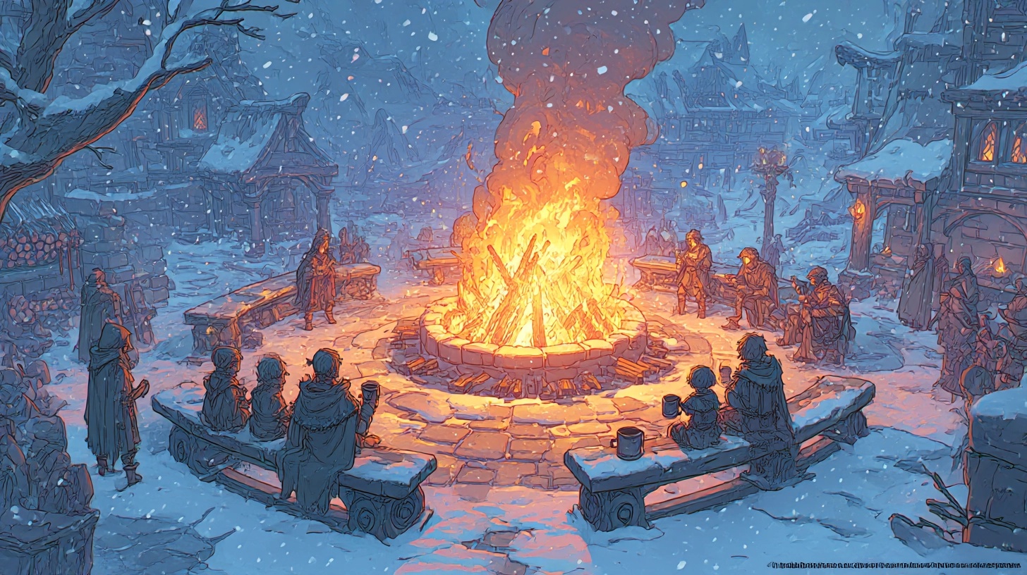 When the first tendrils of smoke rise from the unlit bonfire, the people of the village begin to gather, emerging from their homes like shadows against the snow. Every face is turned toward the great firepit at the center of the square, each pair of hands carrying something to contribute. Bundles of wood, sprigs of evergreen, or smaller offerings of herbs and flowers. Hearthwake does not begin when the fire is lit. It begins in this quiet convergence, when the community coalesces like the embers yet to catch flame. The elders arrive first, leaning on staffs carved with the weight of years. These staffs, each unique, are symbols of their authority, but more than that, they are symbols of memory. It is said that the wood remembers every hand that has carried it, every winter it has survived. The elders do not speak much during these moments, but their presence commands a reverence that stills the gathering. They stand at the edge of the firepit, watching as the villagers approach, nodding in silent approval as logs are added to the growing pile. Among the elders, one carries a small brazier cradling last year's ember, a flicker of the past preserved to ignite the future. The children, though not the first to arrive, are perhaps the most eager. Bundled in thick cloaks and scarves, they dart between the adults, clutching their own offerings in mittened hands. Some bring carved wooden figurines, others simple wreaths of dried flowers, their contributions small but earnest. They approach the elders one by one, holding out their gifts with wide eyes and shy smiles. The elders accept these tokens with care, murmuring words of encouragement before placing the items at the edge of the firepit. For the children, this moment is as much about being seen as it is about giving. It is a chance to be acknowledged as part of something larger, to feel the weight of their place in the community. As the bonfire takes shape, the quiet of the gathering gives way to murmurs and the soft sound of feet crunching in the snow. Families cluster together, some sharing the burdens of the elderly, others helping younger villagers carry their offerings. It is a slow but deliberate process, one that feels less like a task and more like a ritual. Even those who have little to give, a single log or a handful of dried rosemary, are treated with the same respect as those who bring armfuls of wood. Hearthwake is not a festival of wealth or status. It is a festival of presence. To stand around the fire is to belong. When the pile of wood reaches its height, the elders step forward. All eyes follow as the ember is drawn from its brazier, a single glowing coal cradled like a sacred relic. The elder carrying it bends low, shielding it from the wind, and places it at the heart of the firepit. For a moment, nothing happens. Then, with the first spark of flame, a cheer erupts from the crowd. The fire climbs the logs like it has been waiting for this moment, its light casting dancing shadows across the square. The festival has begun. But Hearthwake is not just a celebration of flame. It is a celebration of life. As the bonfire roars, the village comes alive around it. Children race sleds down snowy slopes, their laughter echoing across the ridges, while adults gather at long wooden tables laden with winter's bounty. Jugs of spiced cider and mead are passed from hand to hand, their warmth spreading through the crowd as quickly as the fire's light. Nearby, storytellers weave tales that rise and fall with the flickering flames. Tales of heroes who conquered the cold with courage and cunning, and of ancestors who first kindled the fire in winters long forgotten. The newlyweds of the year are called forward on the second day, their presence met with applause and cheers. Wrapped together in a single thick blanket, they are presented with another, a gift woven by the community. The patterns stitched into the fabric tell a story of unity, of belonging, of warmth shared even in the coldest of seasons. The couple bows, their hands joined beneath the weight of the blanket, their smiles bright even against the fire's glow. Throughout the three days, the fire is never left untended. Villagers take turns watching it through the night, their shifts marked by the soft singing of old mountain songs or the quiet rhythm of hands tossing logs into the flames. To let the fire die would be unthinkable, a shadow over the year to come, a whisper of disunity. The fire-watchers are not always the elders or the young. They are often those who find comfort in solitude, who carry a quiet strength that keeps the fire alive through the darkest hours. Hearthwake ends not with a grand moment but with a soft, collective sigh. As the final embers glow faintly against the snow, the villagers begin to drift away, their faces flushed from the heat, their hands heavy with traded goods and shared memories. The firepit is left clean, the ashes scattered as offerings to the land. In the quiet that follows, the village feels warmer somehow, as though the fire's light still lingers in their hearts.