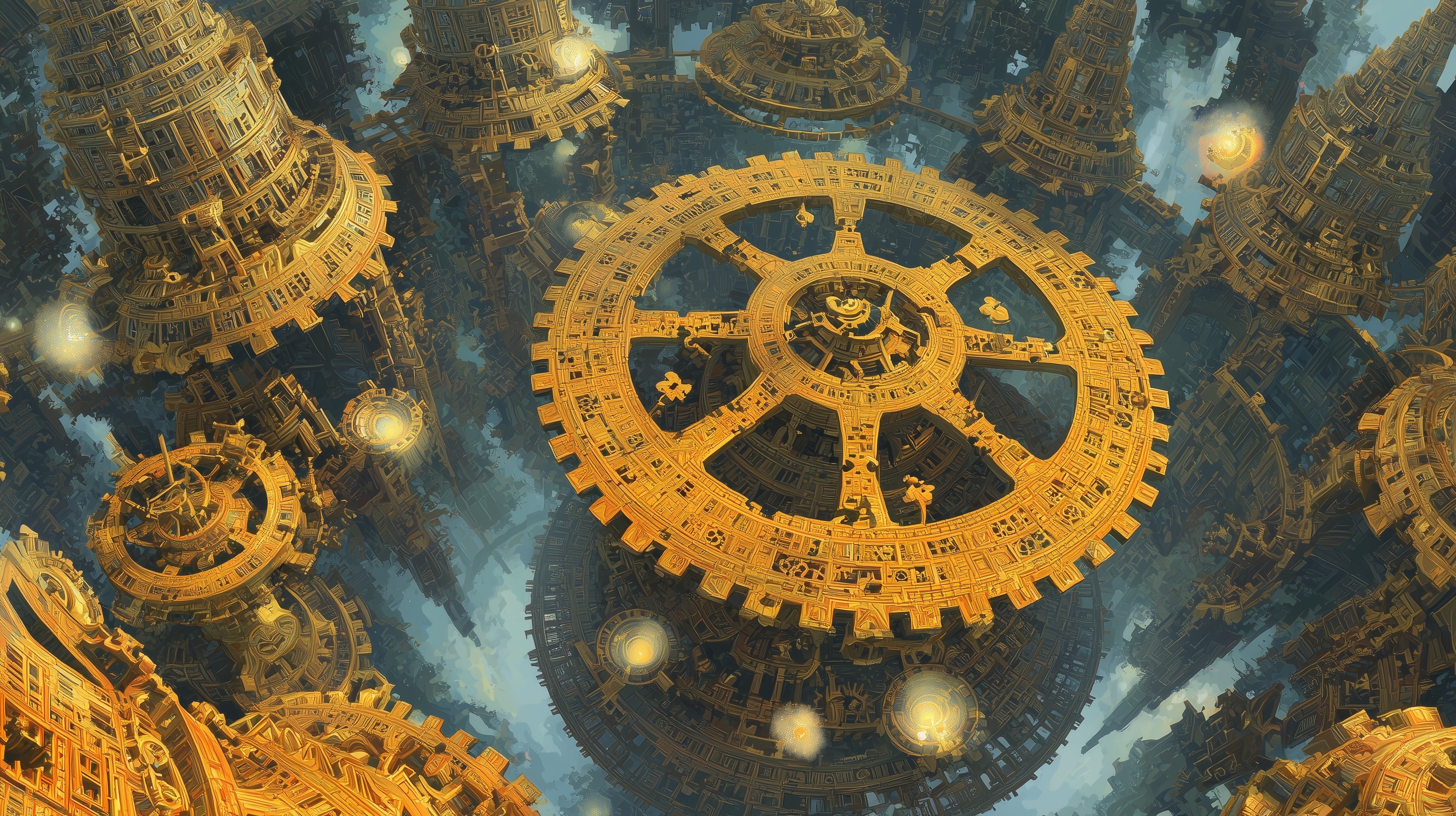 Mechanus is the outer plane of absolute law. It is a realm of perfect order where time, motion, and causality function with complete precision. The entire plane consists of massive, interlocking gears that rotate through the void. Each gear is vast enough to hold cities, landscapes, and civilizations. Gravity adheres to the surface of each gear, and the rotation of one is perfectly synchronized with the others. There is no sky, only the ever-turning complexity of a cosmic machine.