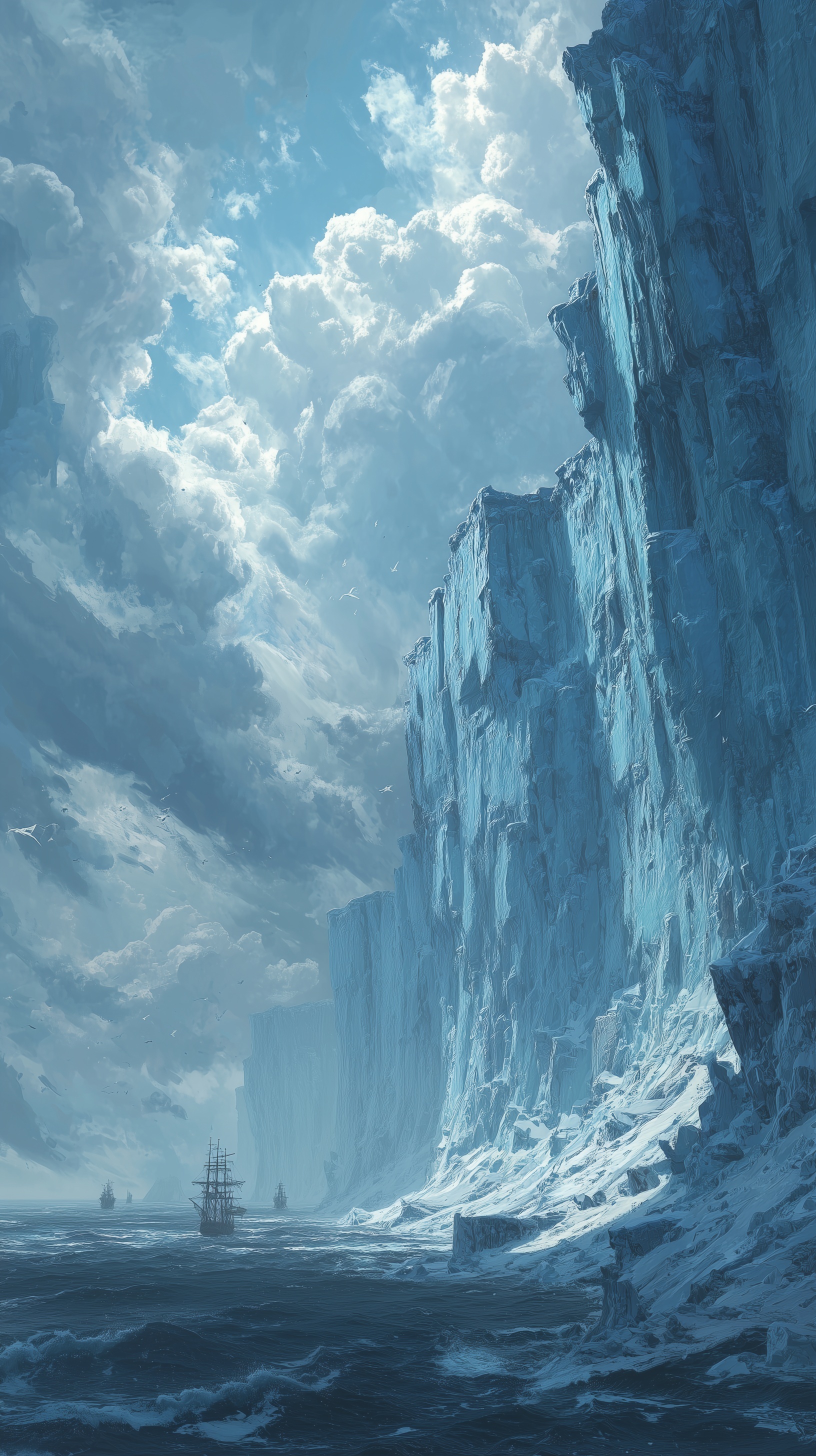 The glacier’s inland face is marked by features both immense and treacherous. Pressure ridges rise like frozen waves, sharp and towering, while crevasses open as black scars that plunge into unseen depths. Subglacial rivers thunder in silence beneath the surface, hollowing caverns that echo with sounds like drums in the night. Travelers tell of entire camps swallowed by sudden collapse, their remains later discovered buried far from where they first stood. Here the land is not a backdrop but an active force, indifferent to survival and hostile to permanence. The winds carve the surface into shapes that shift and vanish as quickly as they are seen. When they race through narrow cuts in the ice they call out with eerie voices, long notes that rise and fall as though words were hidden in their tones. Shimmers of light sweep across valleys where the ice bends and refracts, and in some seasons auroras hang so low they seem to touch the ground. The inland expanse carries with it a constant reminder that the glacier is not a silent land but one alive with sound and change. Plants and animals cling to this environment in pockets of resilience. Mosses and lichens mark exposed stone where avalanches clear the snow. Caribou and musk oxen migrate across the high passes in the brief summers, shadowed by wolves that range far across the ridges. Rumors tell of frost trolls and yeti that claim the hidden valleys, and of wyrms sleeping beneath the ice whose bodies are mistaken for hills until they stir. Each creature is as much a part of the glacier’s rhythm as the storms and avalanches themselves. The coastal front is where this vast body meets The Illusion Sea. For hundreds of miles the glacier falls in sheer cliffs, a continuous wall of blue and white that plunges directly into black water. Calving sends thunder across the horizon as massive slabs break away and crash into the sea. Fog gathers thick around the base of these cliffs, forming and vanishing without warning. Fjords cut deep into the face in only a few rare places, narrow channels that provide temporary shelter and passage during the brief summer calm. To sailors the cliffs are both boundary and hazard. Waves break endlessly against their base, currents twist without pattern, and storms drive ships toward the ice with little chance of escape. Yet the southern passage remains the safer route across the continent, and so each year vessels crowd into fjords while the season allows. Above them the glacier looms, unchanged and unmoved, a citadel of ice that rises from the mountains and commands the sea. Stone Castle Glacier stands as both land and wall. Inland it sprawls in ridges and valleys that shift like a living maze, swallowing those who dare to linger. At the coast it falls in cliffs that tower above the waves, casting their shadow across the sea. It is more than ice and stone. It is an entire realm, vast and merciless, a place that resists both conquest and memory.