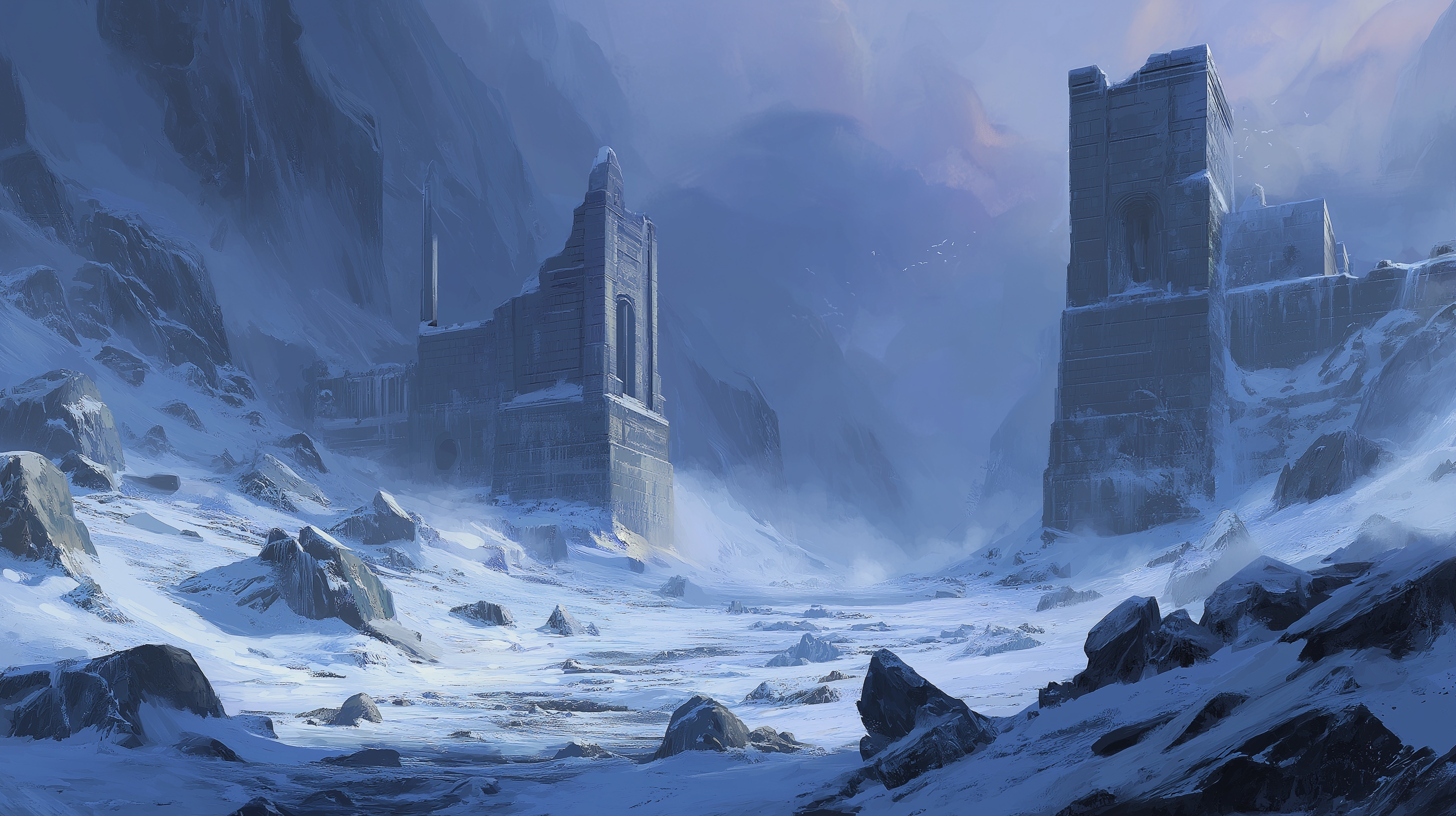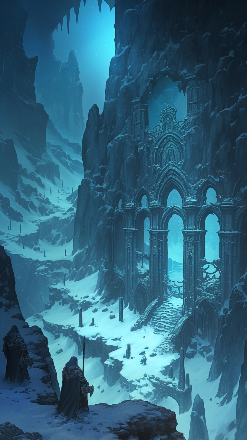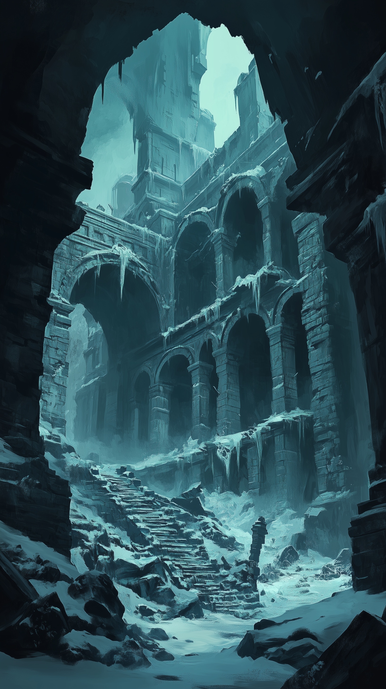 Legends say the earliest mariners saw it as the end of the map. They told of a frozen fortress taller than any mast, its cliffs shining in the light of dawn like walls of glass. Some believed it was a barrier raised by gods to mark the limits of mortal reach. Others saw it as a prison, a place meant to seal away things too dangerous to walk free. Whatever their belief, all agreed it was a place to fear, and for centuries few dared sail its waters. In time the dwarves carved their kingdom beneath it. They dug halls and forges into the stone under the glacier, building a city whose light burned against the cold. Deep Forge rose as the heart of Iron Gate, a marvel of craft and will. For generations it endured, shaping the land above and below, until The Shattering struck and the city fell. The glacier bore silent witness as caverns collapsed and halls filled with ice, leaving behind ruins entombed beneath the weight of centuries.
