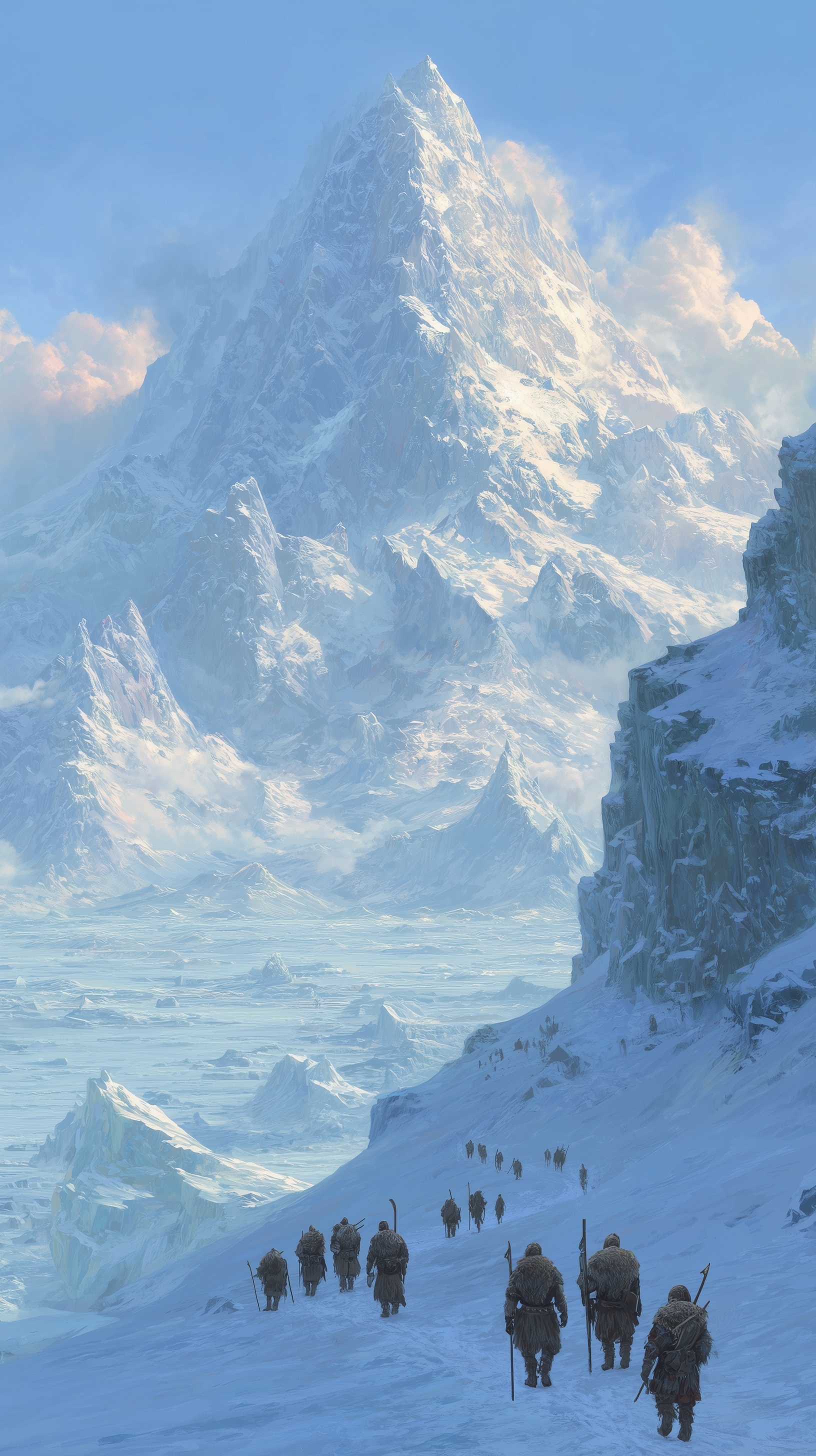 The ruins of Deep Forge remain the greatest lure. Adventurers form bands to seek its collapsed halls, hoping to uncover relics or treasure preserved in the ice. Every tale of recovered arms, half-buried forges, or lost vaults sparks another expedition. Few return with more than scars or fragments of stone, yet each fragment is enough to prove the ruins are real, and that greater prizes still lie hidden. Hunters come as well, chasing the creatures that prowl the ridges and valleys. Wolves range far across the inland ice, lean and relentless, their pelts prized by merchants. Caribou herds cross the high passes in summer, feeding both men and beasts, while polar bears stalk meltwater pools with a patience that makes them as dangerous as any predator. Stranger stories tell of yeti, trolls, or shapes that move like men until they vanish into the snow, and these tales only draw more daring hunters to test their skill.