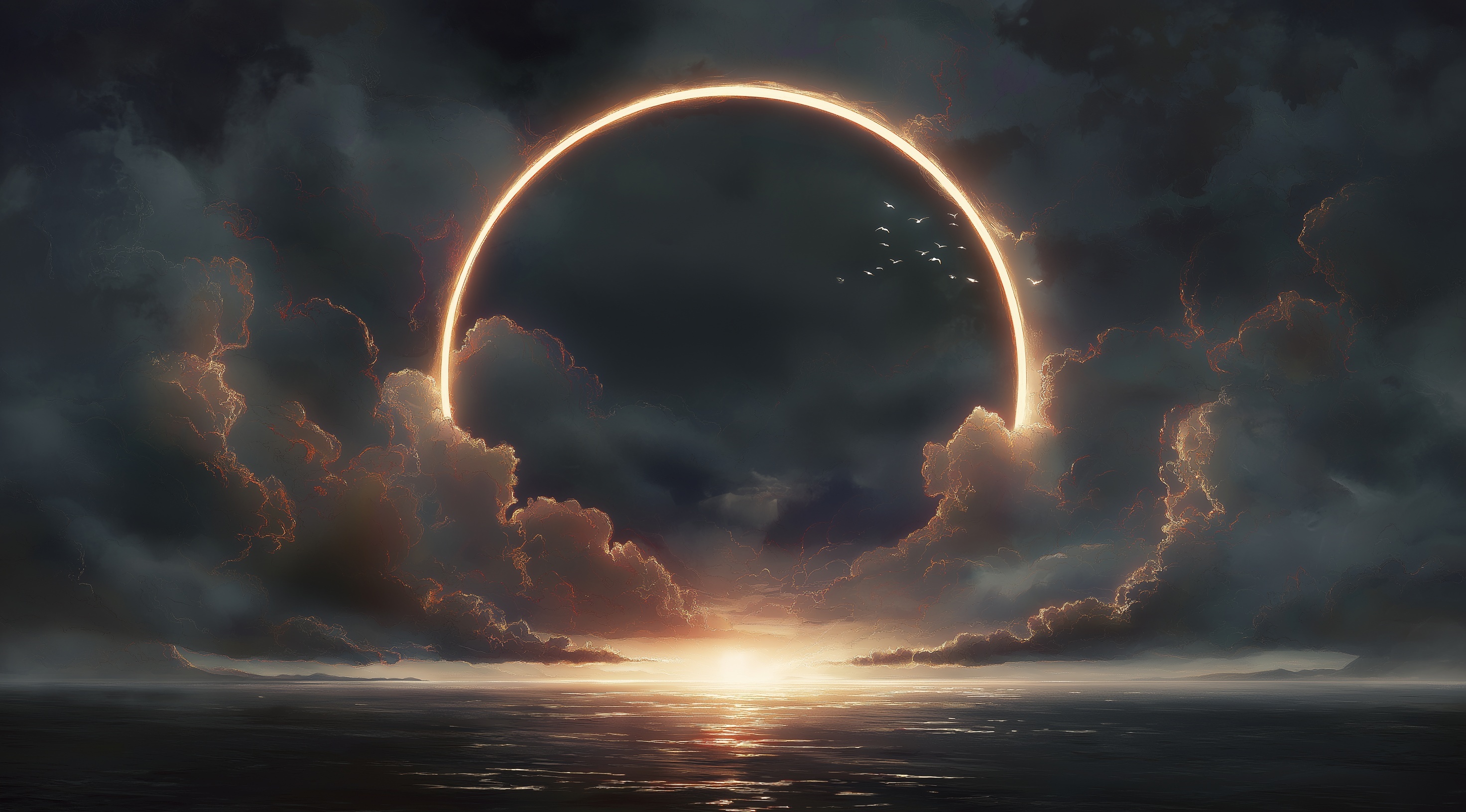 The Umbra does not shine. It does not glow. It does not give off light in any way people understand. It is a shape that blocks out the world. When it appears over the ocean, it rises without a sound. It looks like a wall, but it is not solid. It looks like a cloud, but it casts no shadow. It does not drift. It does not spin. It waits. The sea goes quiet when it comes. The wind stops. The water stills. Even birds fall silent. If a ship is nearby, every tool fails. Compasses spin. Sextants crack. People whisper without knowing why. Sometimes it shows up in the sky instead. During a solar storm or a full eclipse, it spreads across the clouds. It looks like a rip in the sky. The stars around it flicker or vanish. Some people say the stars near it are not the same ones they knew before. Others say the stars come back but not in the right places. Some see lights inside the Umbra. Some see shapes. Some see nothing at all. No one agrees on what is real. They only agree that it is wrong. Colors behave strangely near it. Fires burn blue. Steel shines in colors that are not part of the rainbow. Spelllight stretches too far. Torches flicker without wind. Some people say they can see their own reflection in the dark, even when there is no surface to reflect from. Others say they see the sky twice. Once above them. Once below. At sea, people report false shapes near the Umbra. They see ships that are not there. Islands that drift. People standing on the water who do not speak. Some of these shapes vanish when looked at. Others stay until the Umbra fades. Some crews have chased these shapes for hours, only to find nothing. Others see copies of their own ship nearby, sailing the same course but in reverse. Sound changes too. It becomes thin. Echoes return late or not at all. Some people hear voices. Most of them hear someone they know. Some hear their own voice answering back. These sounds leave no trace. No one can record them. But everyone agrees they felt real at the time. Some people feel the sound in their chest. Others say it comes from the water. Some say they do not hear it at all. They feel it in their bones. When the Umbra leaves, it does not fade. It is just gone. The sea begins to move again. The wind returns. The sky repairs itself. But things are not the same. The sails hang wrong. The ropes feel damp even when dry. Sometimes maps change. Sometimes birds fly in circles for no reason. Some ships leave the Umbra and find that the stars are in the wrong place. Or the moon is missing. Or the sun rises from the west. On land, the Umbra looks like a scar across the sky. It bends light. It warps clouds. At night, it swallows stars. During the day, it turns the sun pale. It does not make things dark. It makes them strange. Trees stop moving. Shadows flicker the wrong way. Water does not reflect the sky. Some people see a second moon. Others see none. Some report seeing a mirror of the world in the sky above them, like a reflection turned upside down. Children who see the Umbra often cannot describe it. They forget what it looked like. They say it was big. They say it was cold. One child said it looked like someone else's eye looking through the sky. Another said it looked like the sun bleeding to death. Some refuse to speak. Others laugh and then cry. No drawing of the Umbra has ever matched another. Artists try. None agree. Some paint spirals. Others paint holes. One painter used only a single streak of gray across a black field and called it finished. Some people believe the Umbra has no true form. What people see is what their minds allow. A shadow of a truth too large to hold. Others say the Umbra changes shape on purpose. They say it knows when it is being watched. They say it shifts to hide what it is. No one can prove this. But too many believe it for the idea to go away. When it is gone, people feel it still. The silence stays in the air. The weight remains in the chest. The water stays too calm. Some say you can feel the Umbra days later if you sail through the right part of the sea. The Umbra does not end when it vanishes. It lingers. It waits. And it always comes back.