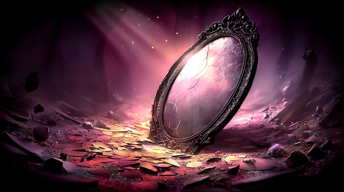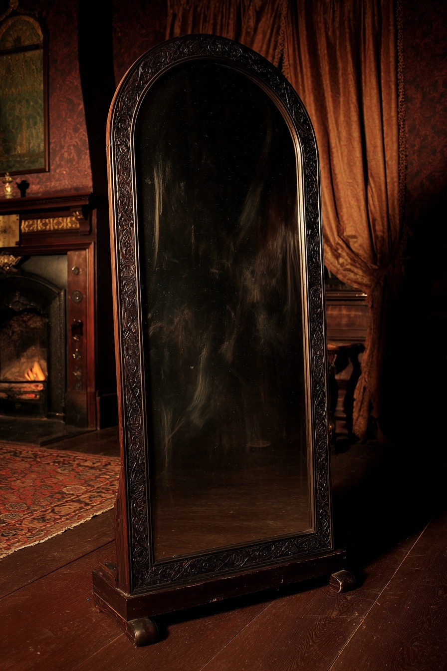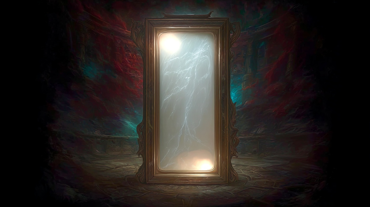 The wizard who created the Parting Mirror was named Halveth Ruun, a transitive arcanist whose reputation rested on his work mapping decision based divergence in living subjects. His catastrophe was not theoretical. It was witnessed, recorded, and quietly buried. Ruun was married, and his partner died during a sanctioned planar experiment when a containment circle failed by a margin so small it was later measured in heartbeats. Ruun survived. The records list the death as accidental, unavoidable, and closed. Ruun did not accept that verdict. He became convinced that the failure represented only one possible outcome, and that survival elsewhere proved the error could be corrected. Ruun’s fixation hardened into doctrine. He isolated himself and began reconstructing the experiment not to prevent the death, but to locate the version of reality in which it had never occurred. His journals describe hundreds of modeled timelines in which the same moment unfolded differently. In many, his partner lived. In most, Ruun himself did not. This did not deter him. He concluded that survival was irrelevant. What mattered was identifying a version of the world where the desired outcome already existed and finding a way to step into it without destabilizing the surrounding structure. The manufacturing process began with Ruun dismantling his own sanctum and reconfiguring it into a compression chamber for probability. He layered containment wards not to repel intrusion, but to prevent divergence. For weeks at a time, the interior of the chamber existed under enforced sameness, a state in which events were permitted to occur but forbidden to resolve differently. Ruun subjected himself to these conditions repeatedly, documenting memory loss, emotional flattening, and gaps in continuity as acceptable degradation. He wrote that a self willing to be improved must be prepared to be thinned. The mirror’s reflective surface was created through an act of self displacement. Ruun engineered a convergence between two versions of himself, one who had lost his partner and one who had not. The process did not merge them. It selected between them. The mirror was formed at the moment that choice was enforced, capturing the boundary where one Halveth Ruun continued and the other was removed. The surviving Ruun could not later determine which life he had originally lived, only that the mirror now worked exactly as intended. Completion of the mirror required final calibration, during which Ruun tested it repeatedly on lesser divergences. Animals. Servants. Eventually, associates who trusted him. The records do not describe screams or resistance. They describe confirmation. Each successful use reinforced his belief that the mirror was not an abomination but a correction mechanism. He wrote that grief was a symptom of limited perspective and that once a better version of oneself existed, remaining in a worse one was an act of negligence. Ruun’s last entry is dated three days after the mirror’s final stabilization. It contains a single sentence written with unusual care. “I see her waiting, and this time I know which side I am on.” When investigators later entered the sanctum, they found the mirror uncovered, the chamber intact, and no sign of Halveth Ruun. His partner’s name appeared nowhere in the room, not in ink, not in memory wards, not even in the mirror’s reflection. The artifact was complete. The price had already been paid. The frame of the Parting Mirror is not fashioned from any single metal, wood, or stone that can be cleanly identified. Analyses conducted by those with the means to attempt them describe a composite material that resists categorization, behaving like worked obsidian under pressure while exhibiting the density and thermal indifference of deep stone. When cut or scored, the material heals slowly over time, seams drawing themselves closed as though the frame were remembering an earlier, uninterrupted shape. No tool marks remain for long, which has led some to conclude that the frame was not constructed so much as persuaded into its current form. The reflective surface itself is not glass in any ordinary sense. It contains no measurable sand content and does not fracture when struck, instead rippling briefly before settling again into perfect stillness. Those who have examined fragments taken during rare moments of instability report that the surface absorbs light rather than reflecting it, returning only what it has already decided to show. Under magnification, the mirror reveals layers that do not align spatially, as though multiple depths occupy the same plane. Attempts to remove or thin the surface invariably fail, the material reverting to its original thickness regardless of how much is scraped away. Embedded within the mirror, though never visible at the same angle twice, are inclusions resembling veins or threads suspended behind the reflective plane. These filaments are believed to be composed of condensed probability, a substance theorized but never successfully harvested elsewhere. Their presence suggests that the mirror’s function depends not on raw magical force, but on constraint. These threads do not generate outcomes. They bind them, locking countless potential lives into fixed relationships so the mirror can identify which version may be exchanged without unraveling the structure entirely. The backing of the mirror is rumored to contain organic components, though no consensus exists on their origin. Some accounts speak of cured membranes taken from beings that existed briefly across multiple realities at once, creatures whose deaths produced remains that did not agree on where they had occurred. Others describe the material as having once been human, though stripped of any defining features before incorporation. When exposed to certain divinatory techniques, the backing responds with patterns consistent with residual identity, suggesting that something capable of being so